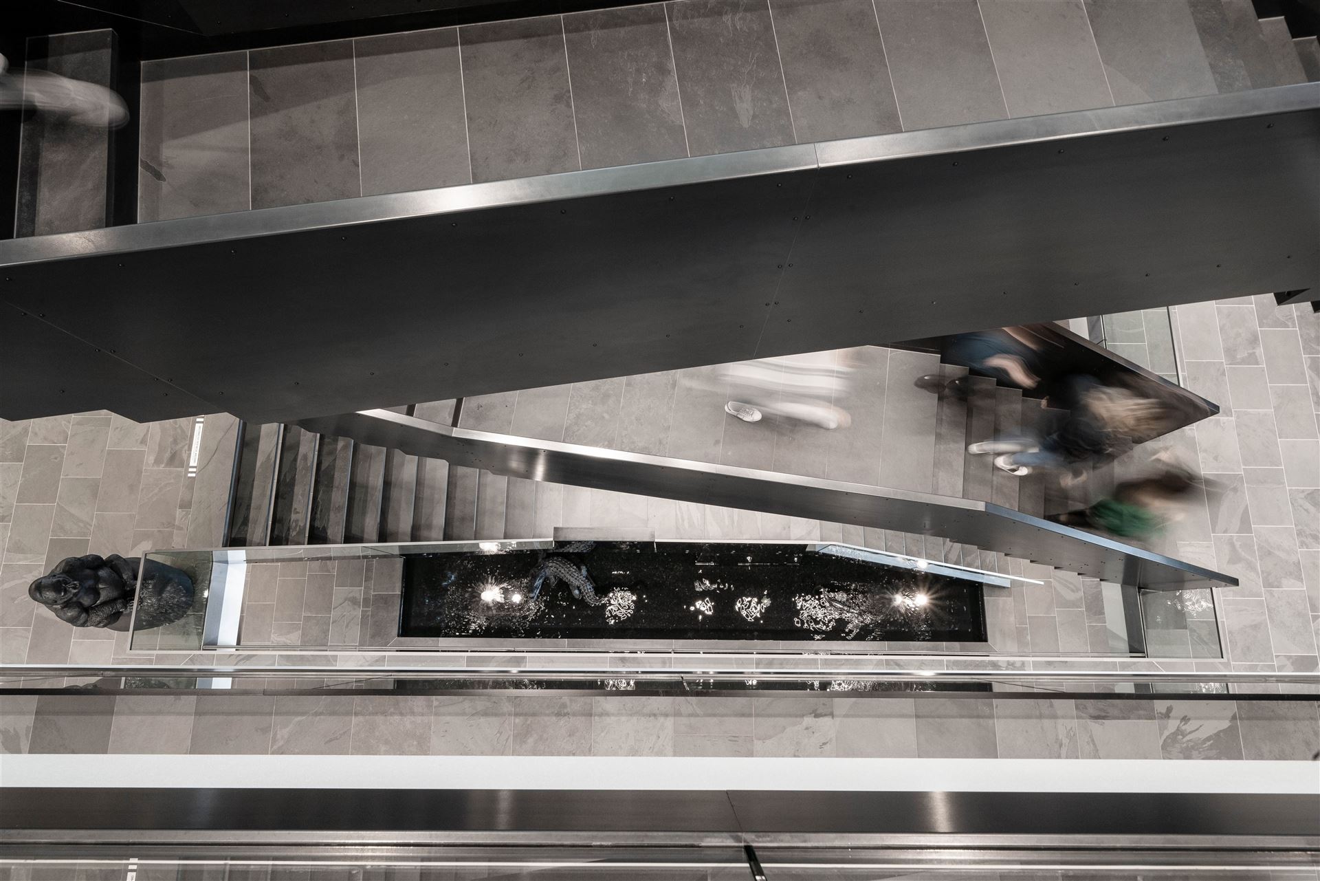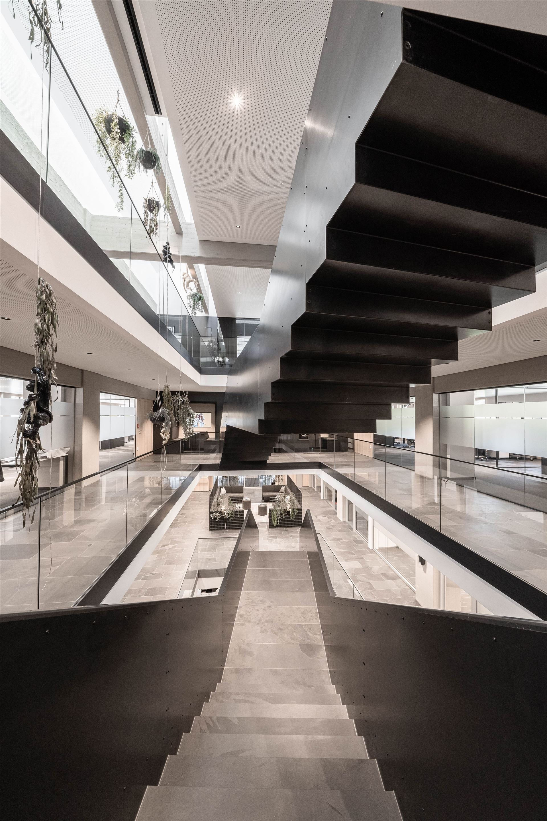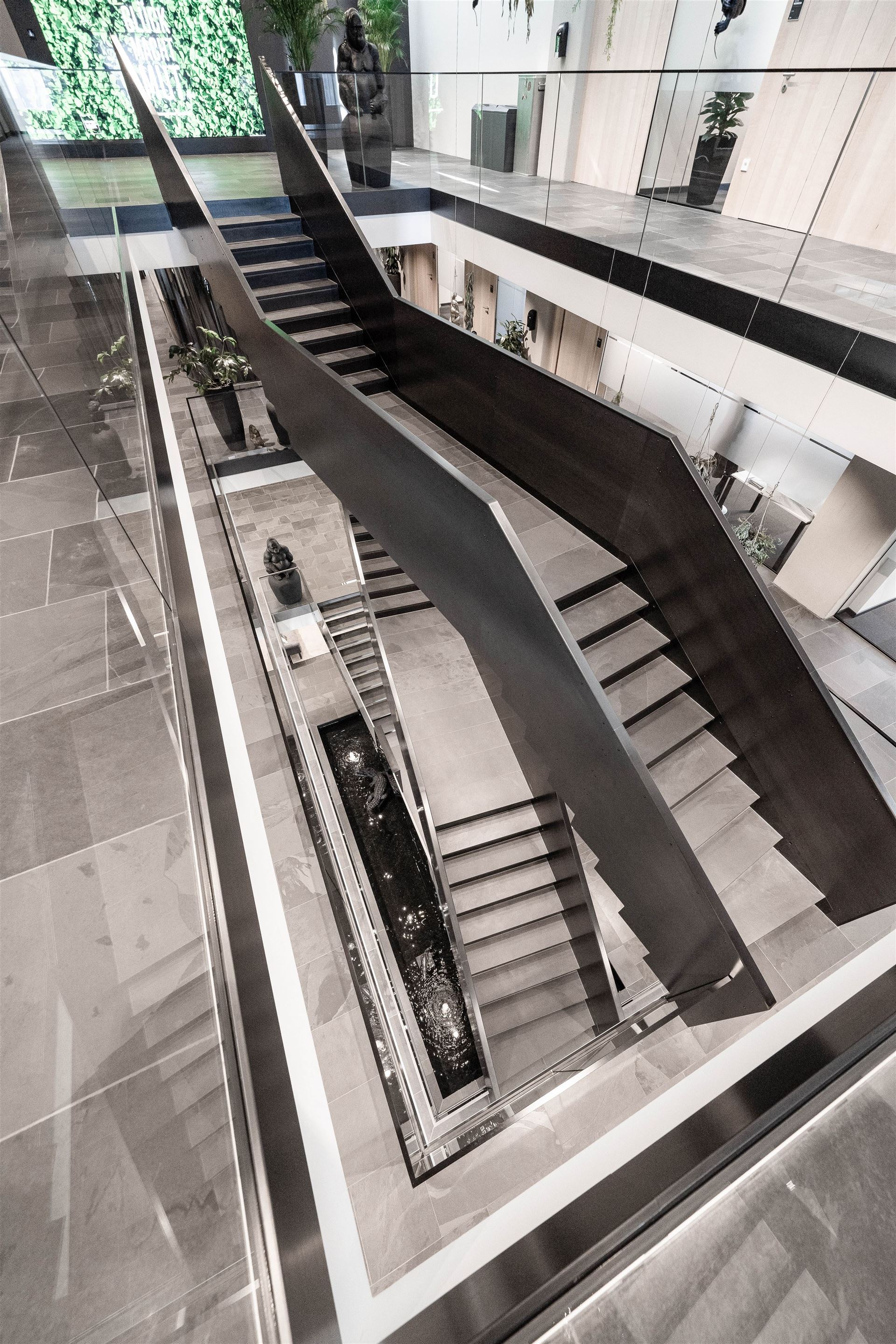 Die beiden oberen, bislang ungenutzten Stockwerke des Gebäudes wurden vom ersten Obergeschoss aus erschlossen. Dabei durften wir zwei elegante, schwarze Treppen aus Naturstahl samt tragendem Geländer und zarten Glasbrüstungen montieren – eine Aufgabe, die alles andere als einfach war. Der einzige Zugang zu dem von außen vollständig intakten Gebäude war eine kleine Öffnung in der Fassade des zweiten Obergeschosses. Durch diese schmale Öffnung wurden die Treppenteile mithilfe eines Autokrans ins Innere gehoben, sorgfältig zusammengesetzt und präzise in Position gebracht. Diese Millimeterarbeit stellte unsere Monteure vor höchste Anforderungen an Präzision und Konzentration. Doch sind es nicht genau diese Herausforderungen, die jeden Tag aufs Neue aufregend und lebenswert machen? Bei dieser Antwort sind wir uns mehr als sicher!