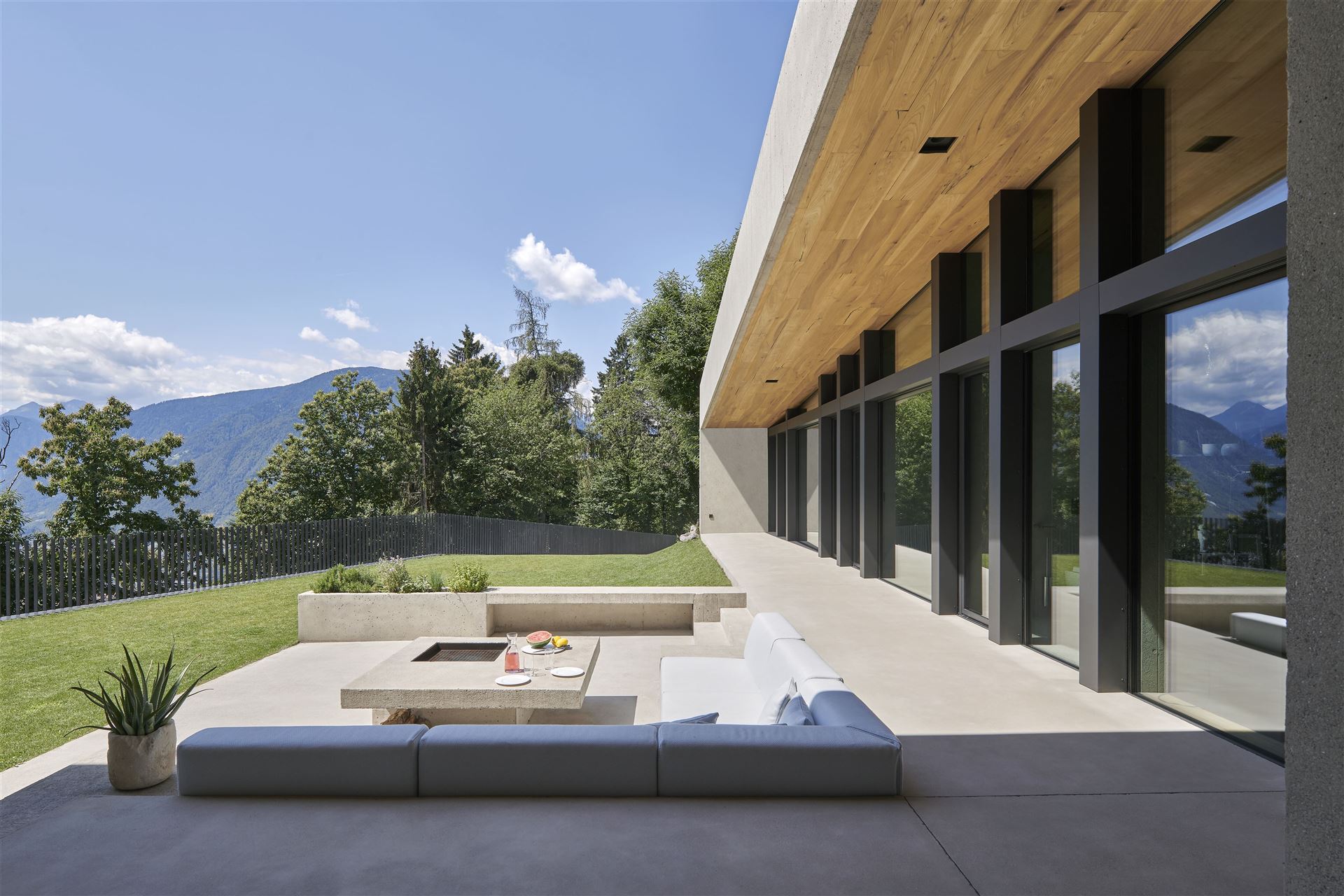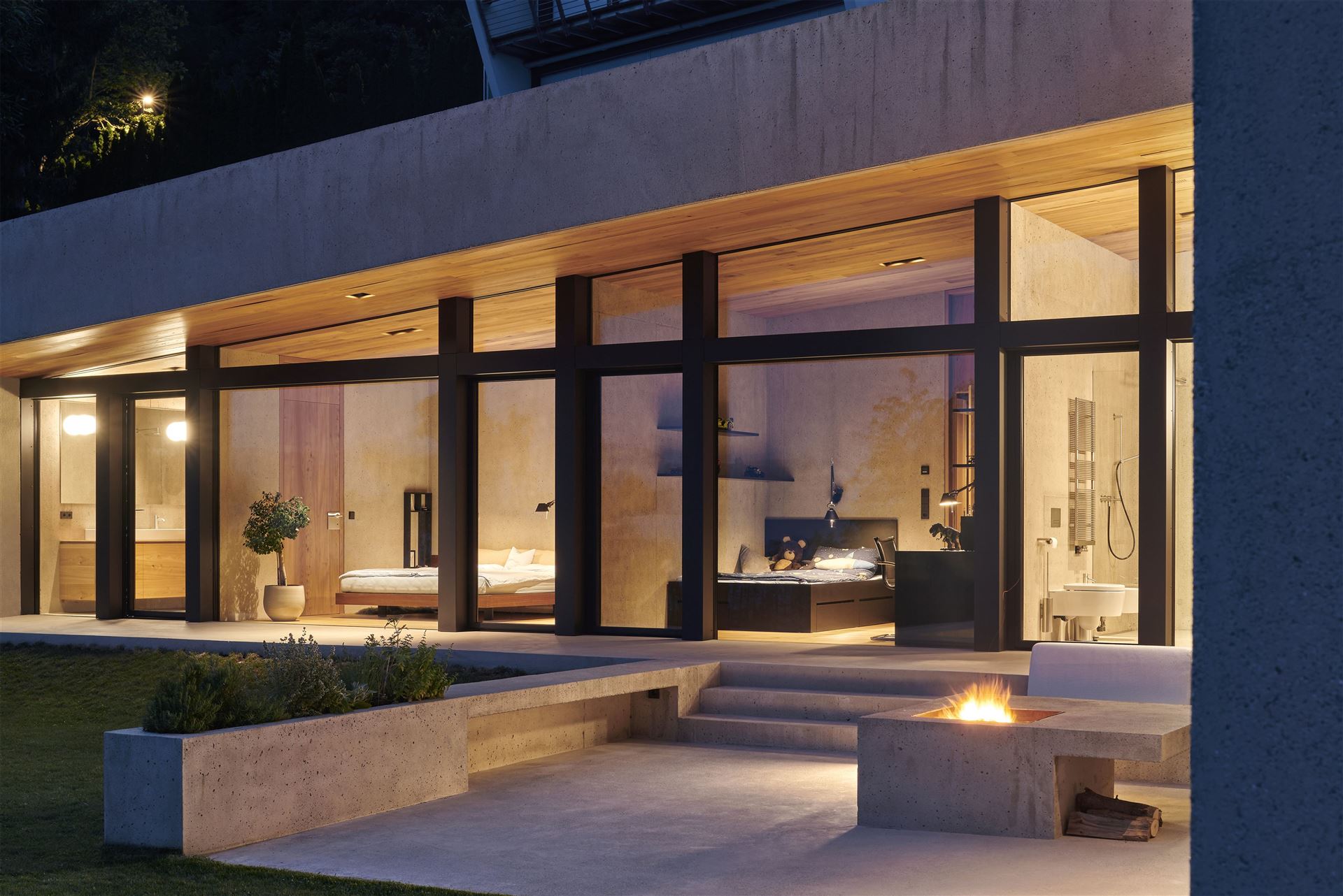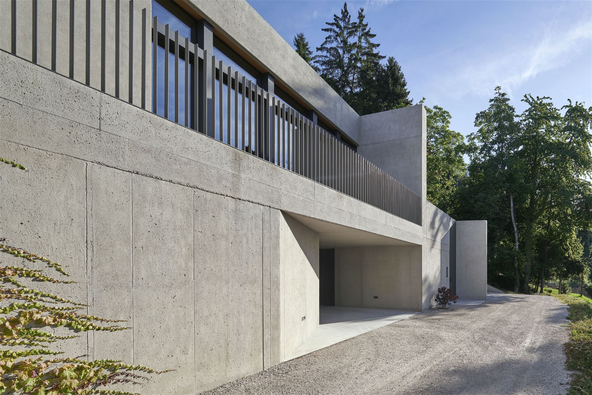Sichtbeton, helles Holz, viel Glas und schwarzes, pulverbeschichtetes Aluminium verleihen dem Gebäude – gekonnt kombiniert – eine einzigartige Ausstrahlung von Ruhe und Modernität. Die architektonische Meisterleistung dieses Projekts zeigt sich nicht nur in der Optik, sondern auch in den zahlreichen durchdachten und aufwendig umgesetzten Details. So fügt sich beispielsweise das 4,5 Meter hohe schwarze Eingangstor nahtlos in die klare Linienführung der Betonelemente ein. Die Geländer der Gartenbegrenzung kommen ganz ohne Handläufe aus und ermöglichen so einen ungestörten Blick auf die geometrische Formensprache des Gebäudes. Zudem sind die großflächigen Glasfassaden teilweise mit unsichtbaren Profilen verankert, was die elegante und minimalistische Anmutung unterstreicht.