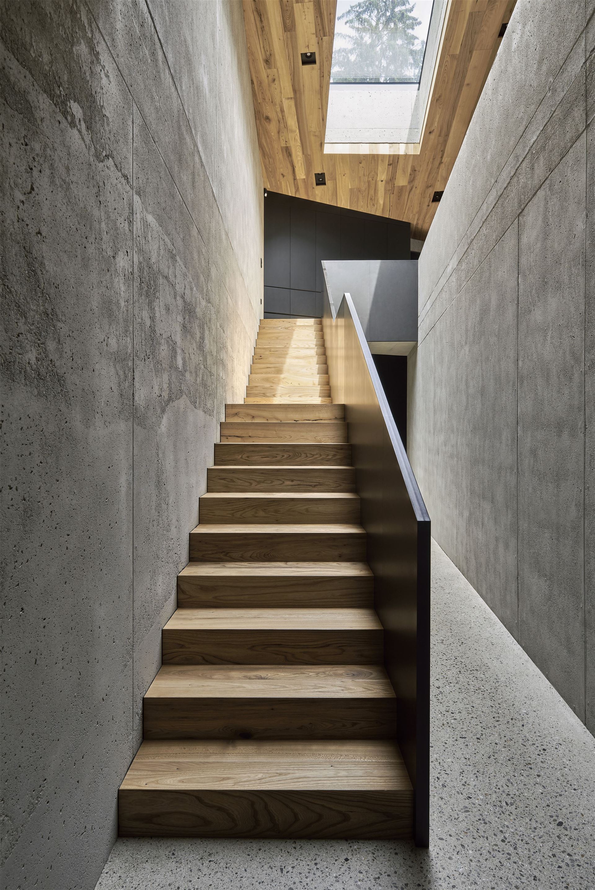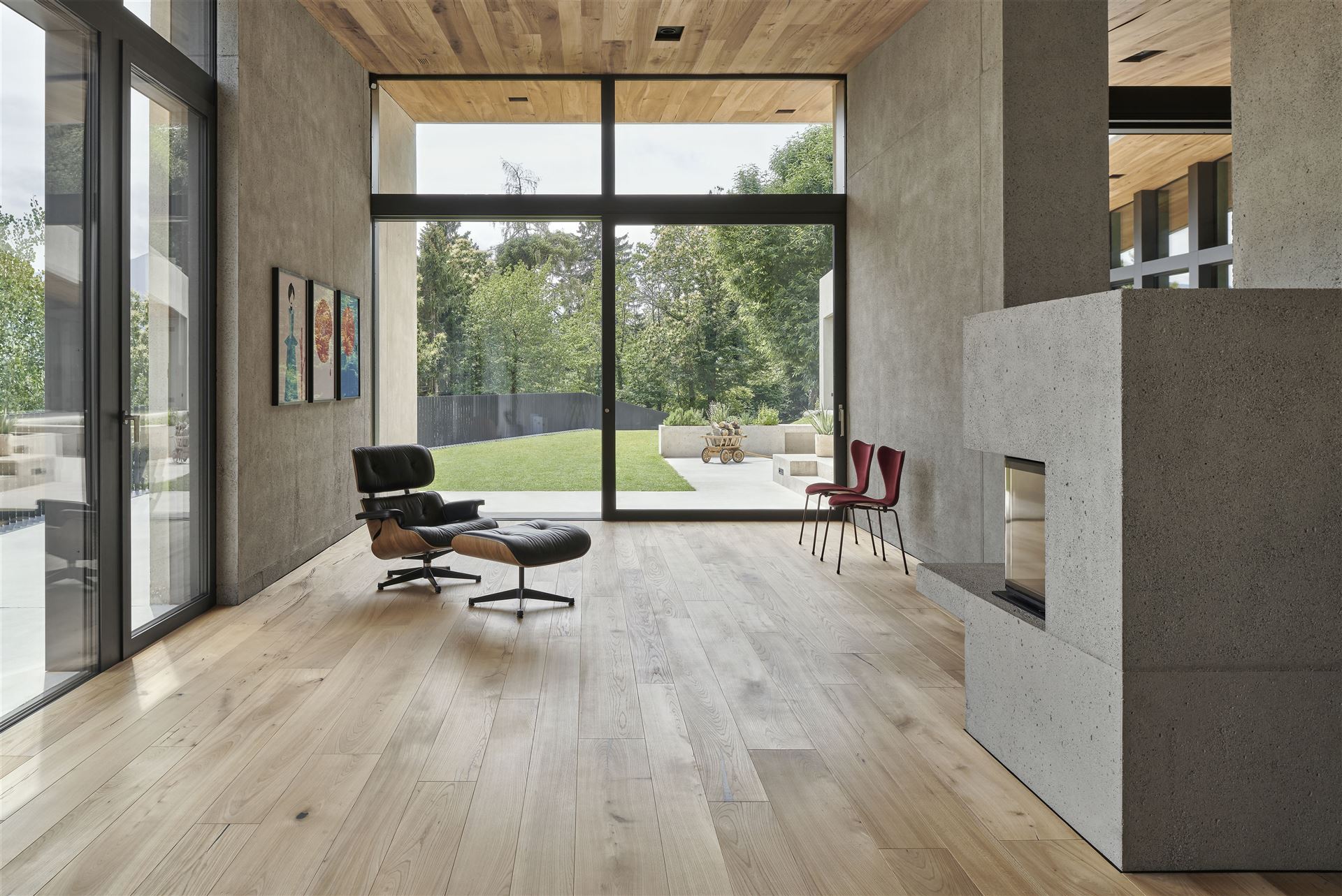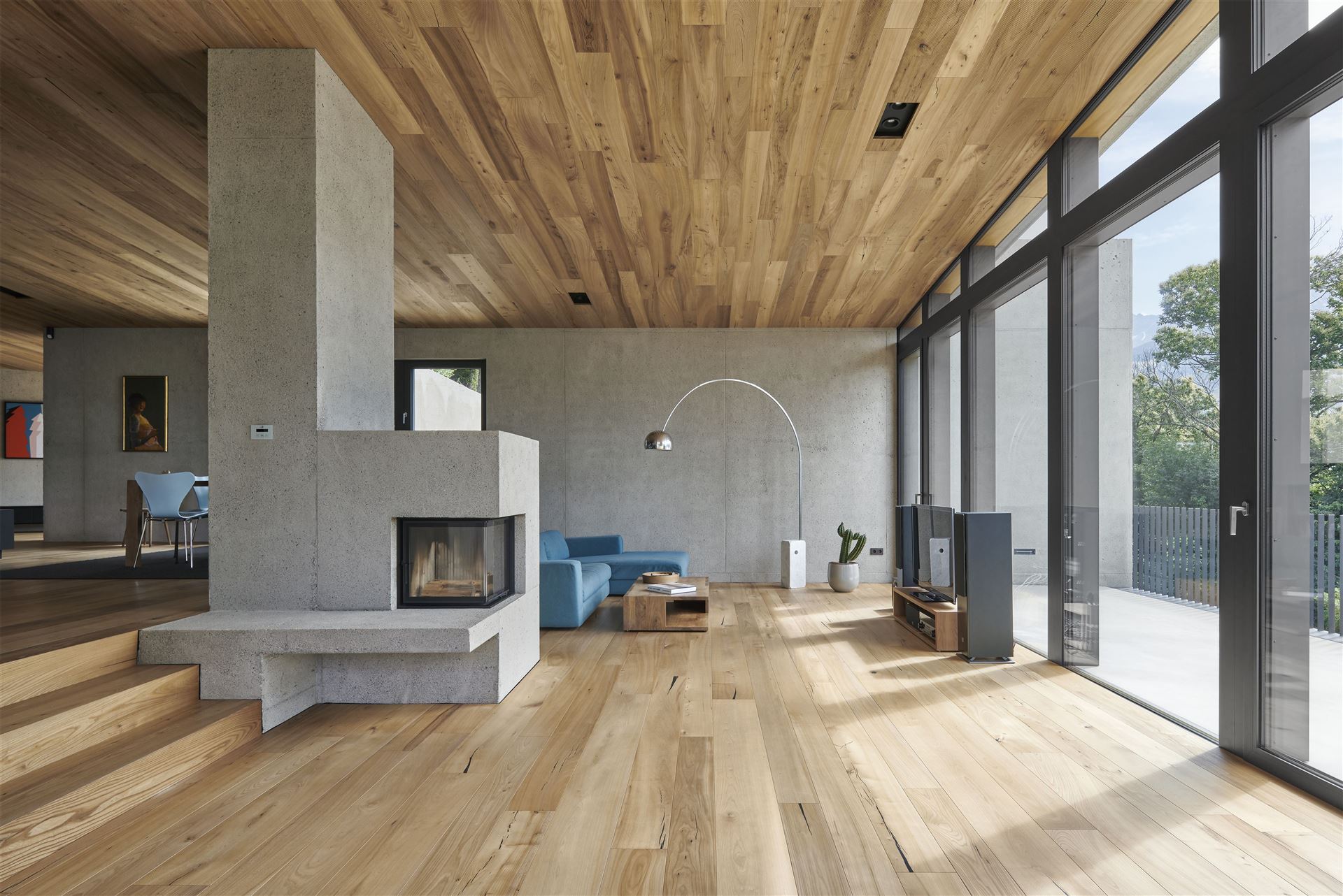 Sichtbeton, helles Holz, viel Glas und schwarzes, pulverbeschichtetes Aluminium verleihen dem Gebäude – gekonnt kombiniert – eine einzigartige Ausstrahlung von Ruhe und Modernität. Die architektonische Meisterleistung dieses Projekts zeigt sich nicht nur in der Optik, sondern auch in den zahlreichen durchdachten und aufwendig umgesetzten Details. So fügt sich beispielsweise das 4,5 Meter hohe schwarze Eingangstor nahtlos in die klare Linienführung der Betonelemente ein. Die Geländer der Gartenbegrenzung kommen ganz ohne Handläufe aus und ermöglichen so einen ungestörten Blick auf die geometrische Formensprache des Gebäudes. Zudem sind die großflächigen Glasfassaden teilweise mit unsichtbaren Profilen verankert, was die elegante und minimalistische Anmutung unterstreicht.