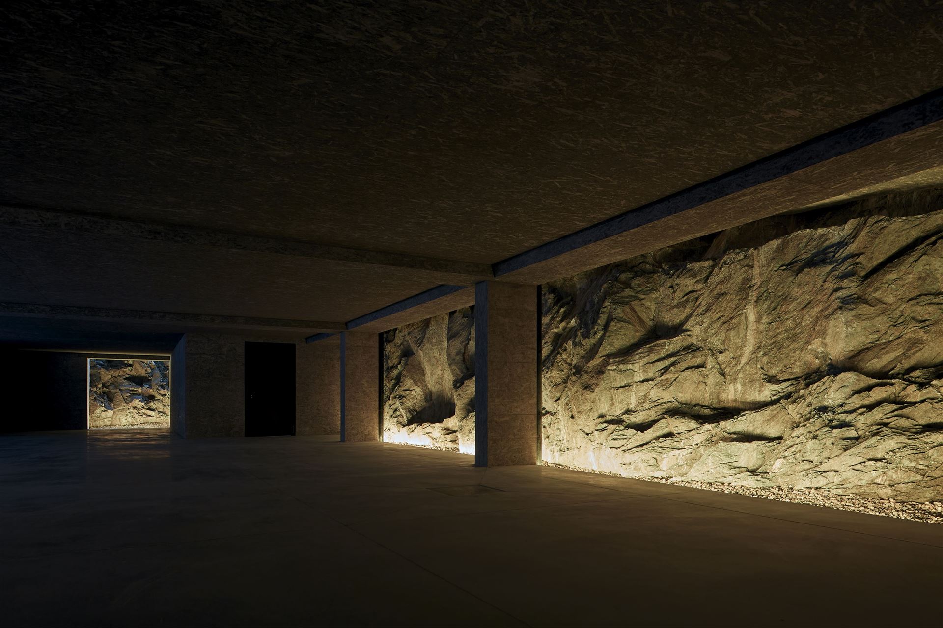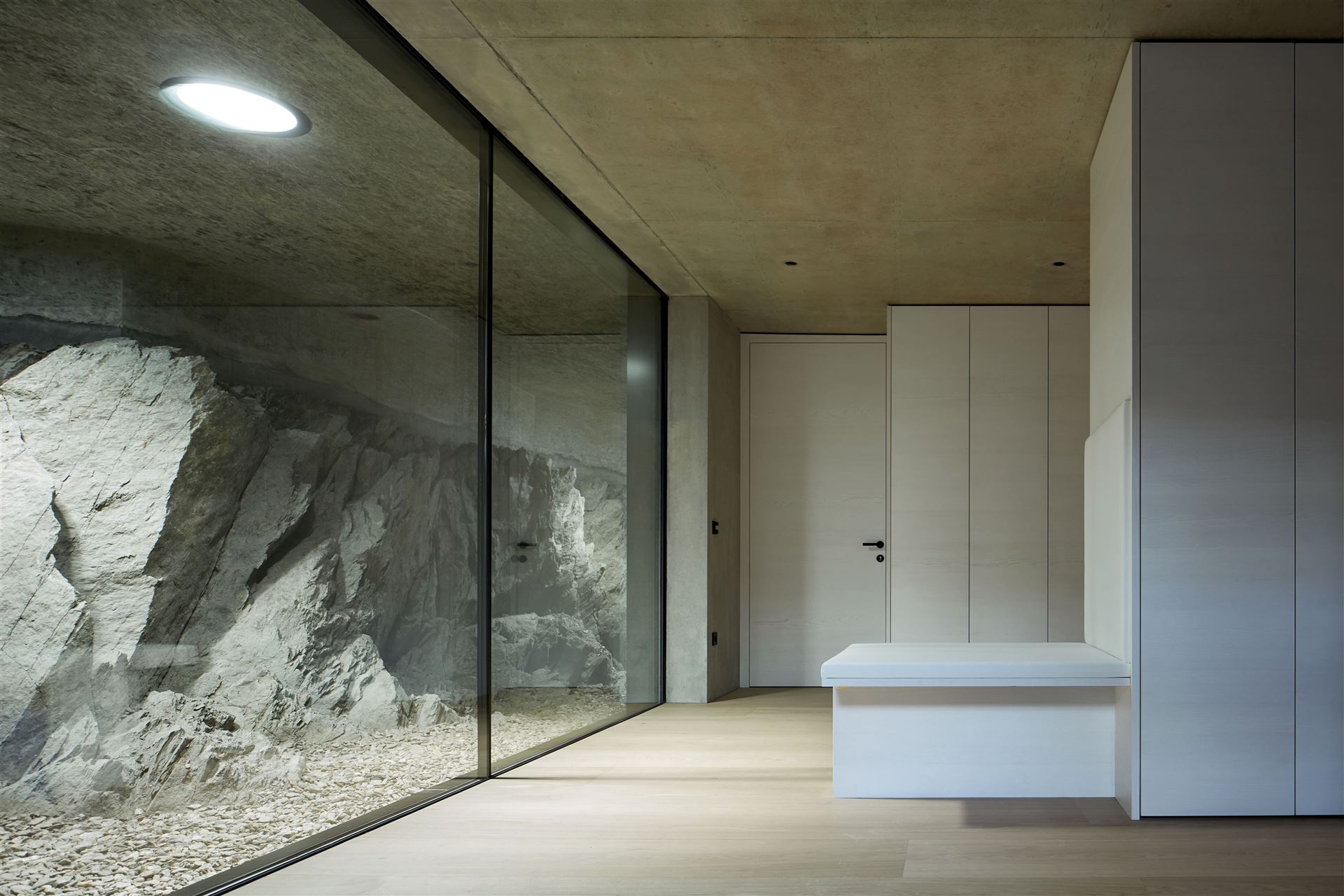 Sämtliche äußere Oberflächen des Gebäudes bestehen entweder aus einer vorgesetzten und hinterlüfteten Fassade mit schwarzer Glasverkleidung oder flächenbündig in selbige integrierten Glasflächen und Schiebetüren, von welchen insgesamt 20 im gesamten Haus verbaut wurden. Ebenso flächenbündig sind die Glasflächen in Decke und Boden verankert und über minimalbreite 32mm Profile untereinander verbunden. Die Verbindung zum felsigen Untergrund des Hanges wird erst im Gebäudeinneren sichtbar, wo ebenso großzügig verbaute Glaselemente den Blick auf das dahinterliegende Gestein freigeben.