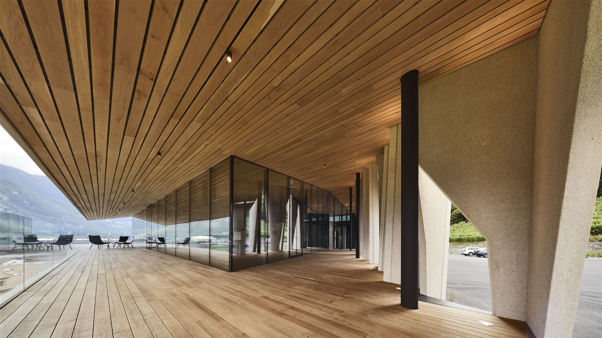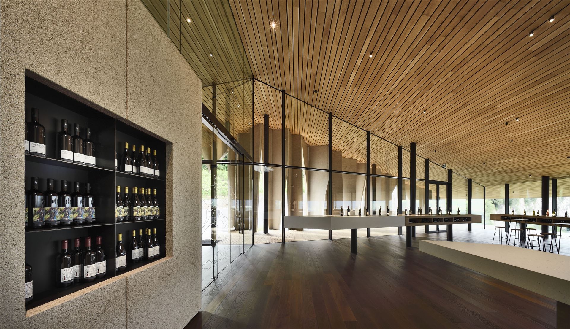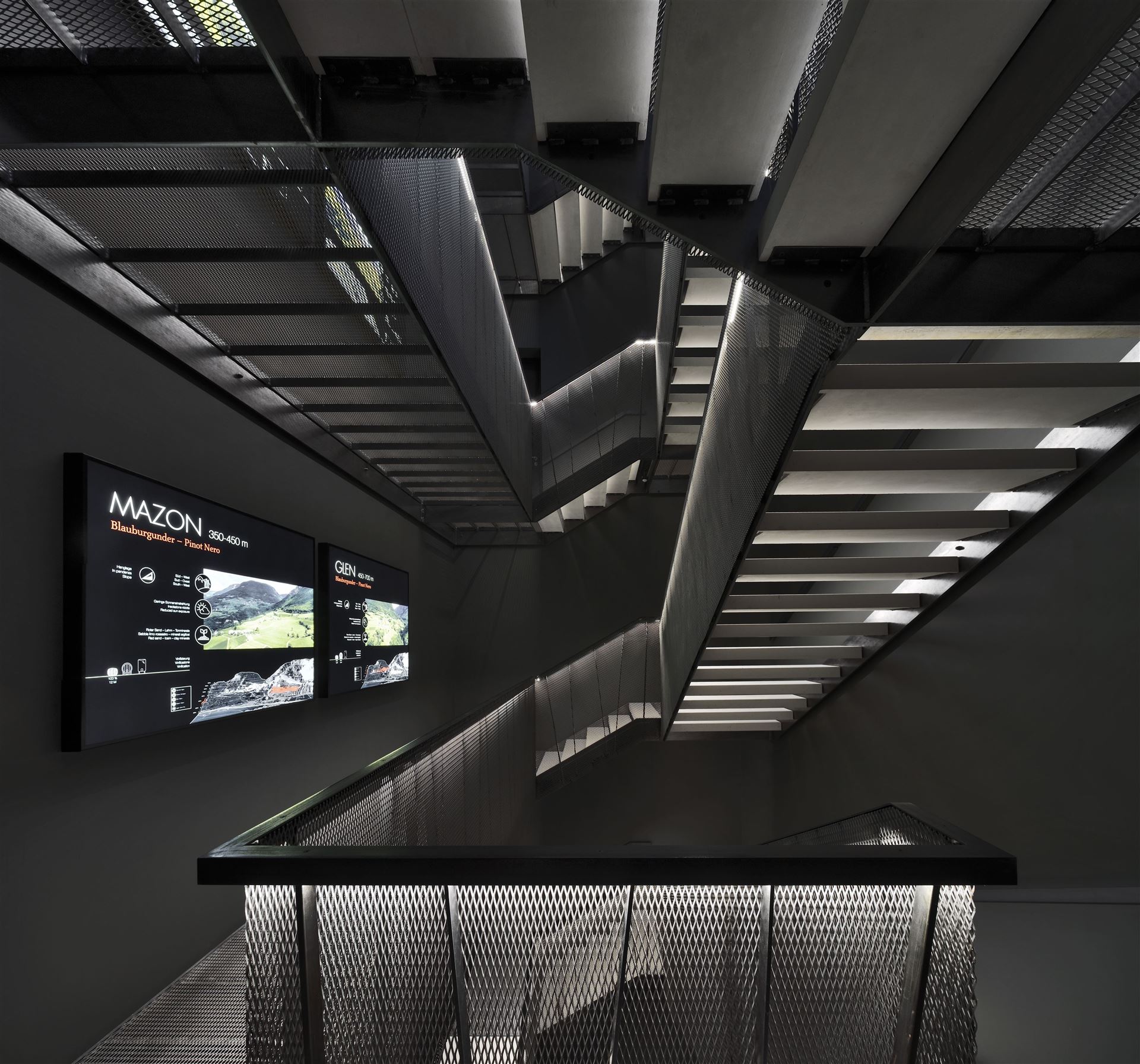 Schon die markante Fassade im Eingangsbereich, die die Formensprache der umliegenden Felswände widerspiegelt, lässt den Besucher erahnen, welch besonderes Erlebnis ihn im Inneren erwartet. Der ebenso außergewöhnliche wie durchdachte Innenraum wird von hellem Tageslicht durchflutet und beeindruckt mit einer bis zu sechseinhalb Meter hohen Glasfront. Die rahmenlos in Decke und Boden versenkten Scheiben eröffnen einen atemberaubenden Blick auf das Südtiroler Unterland. So wird Wein zu einem Erlebnis für alle Sinne!