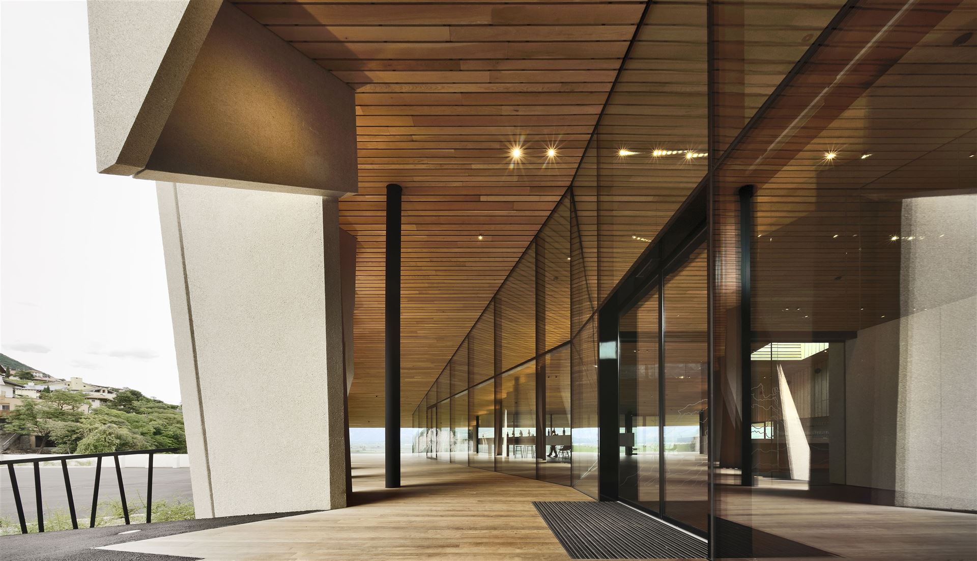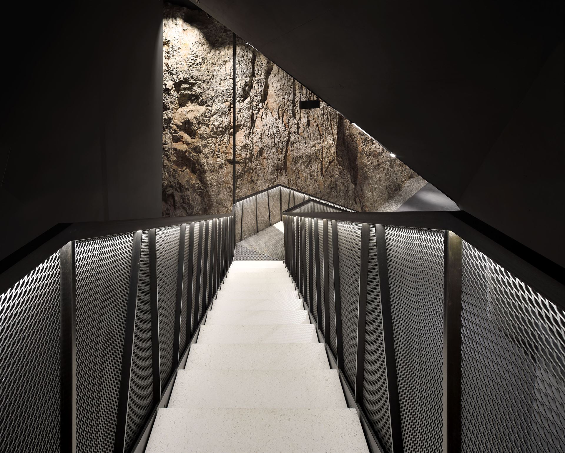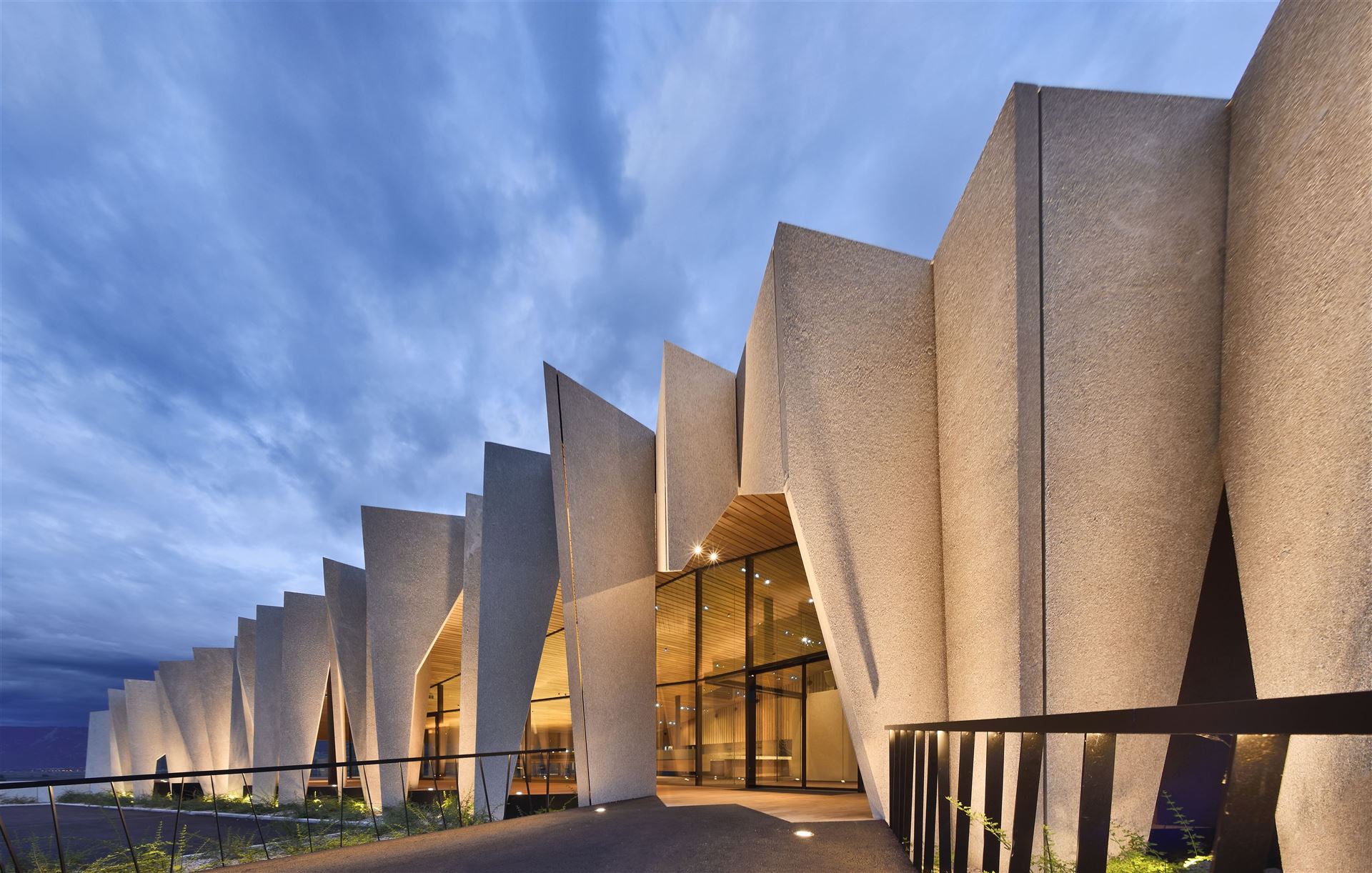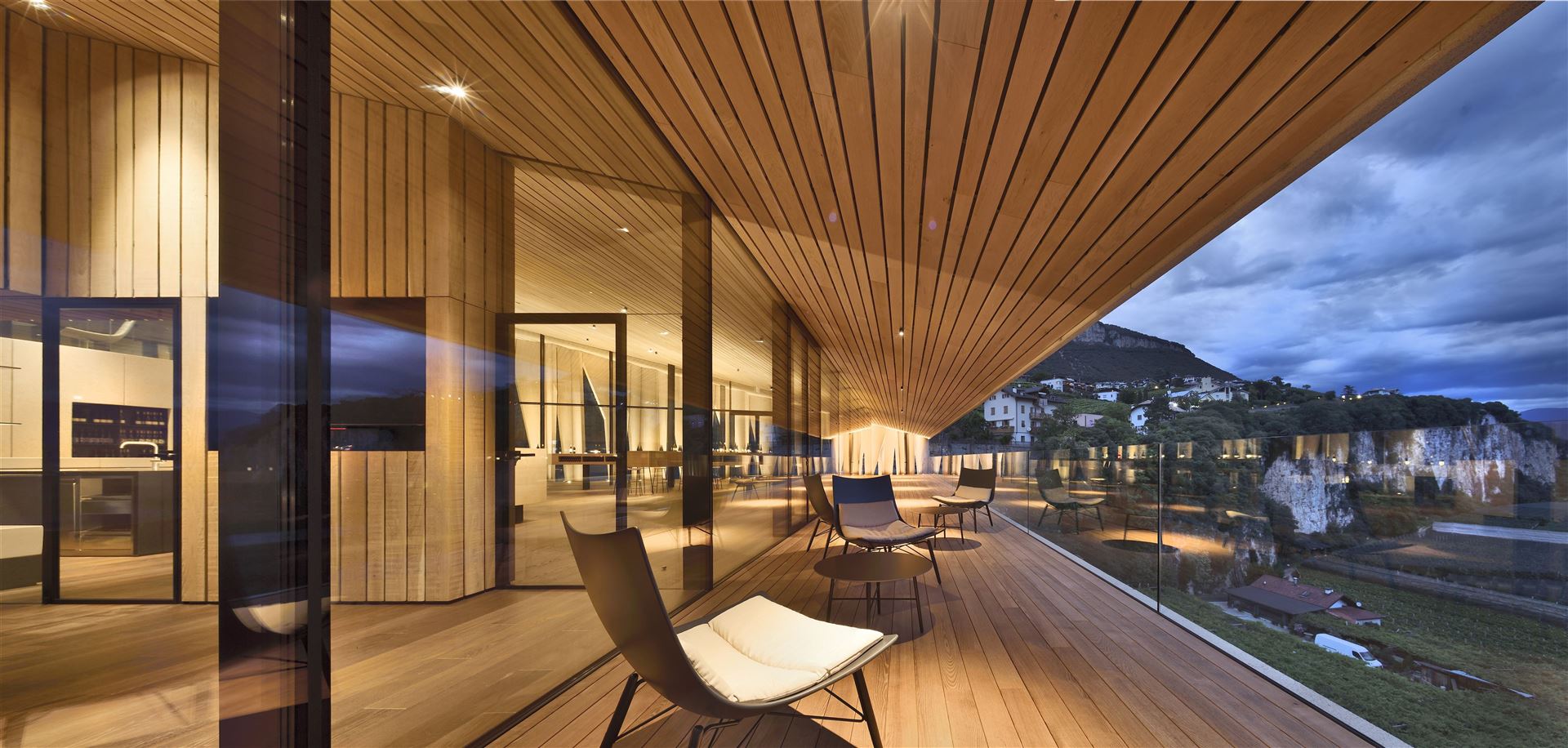 Schon die markante Fassade im Eingangsbereich, die die Formensprache der umliegenden Felswände widerspiegelt, lässt den Besucher erahnen, welch besonderes Erlebnis ihn im Inneren erwartet. Der ebenso außergewöhnliche wie durchdachte Innenraum wird von hellem Tageslicht durchflutet und beeindruckt mit einer bis zu sechseinhalb Meter hohen Glasfront. Die rahmenlos in Decke und Boden versenkten Scheiben eröffnen einen atemberaubenden Blick auf das Südtiroler Unterland. So wird Wein zu einem Erlebnis für alle Sinne!