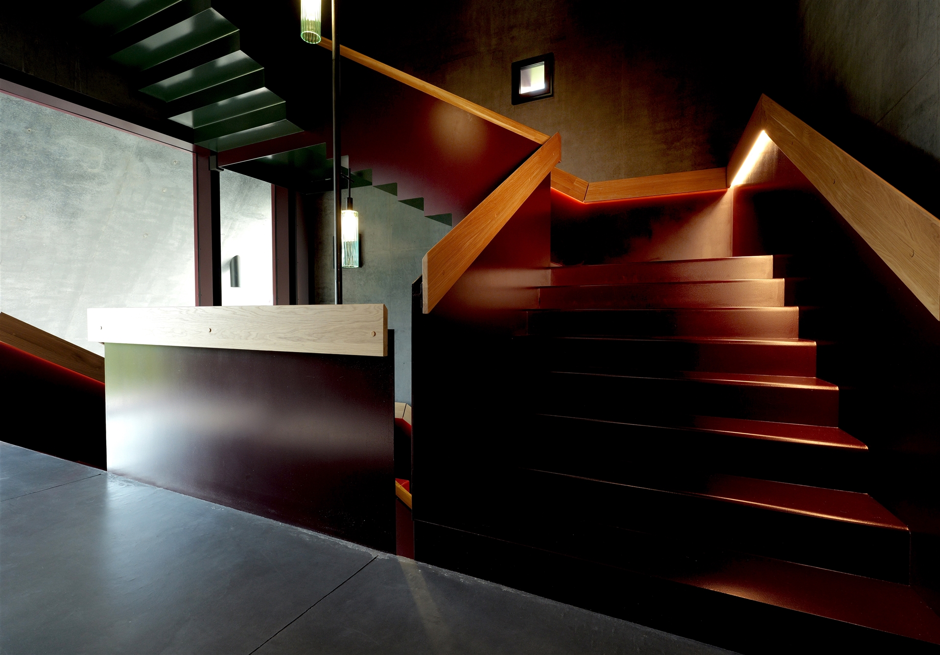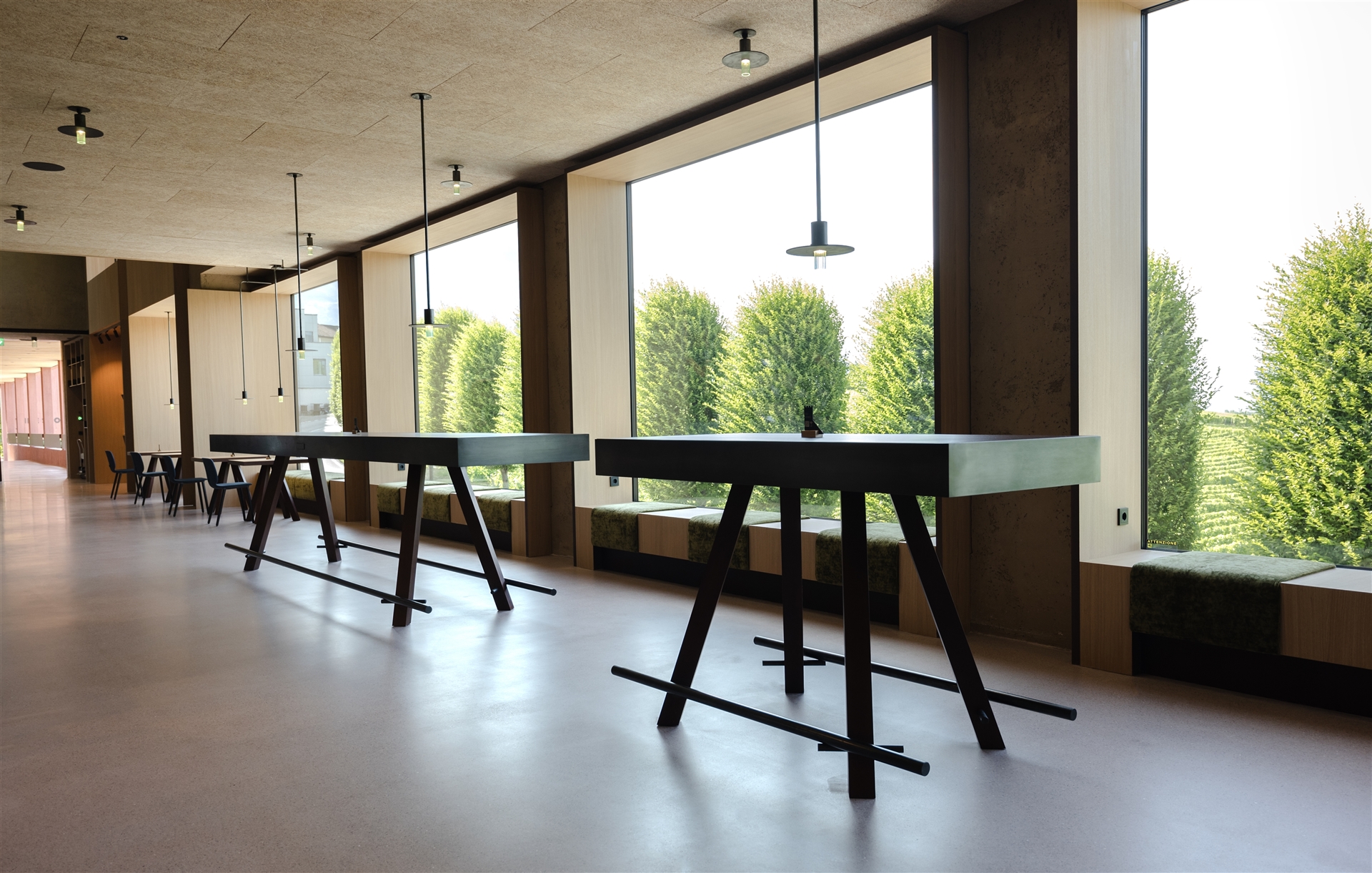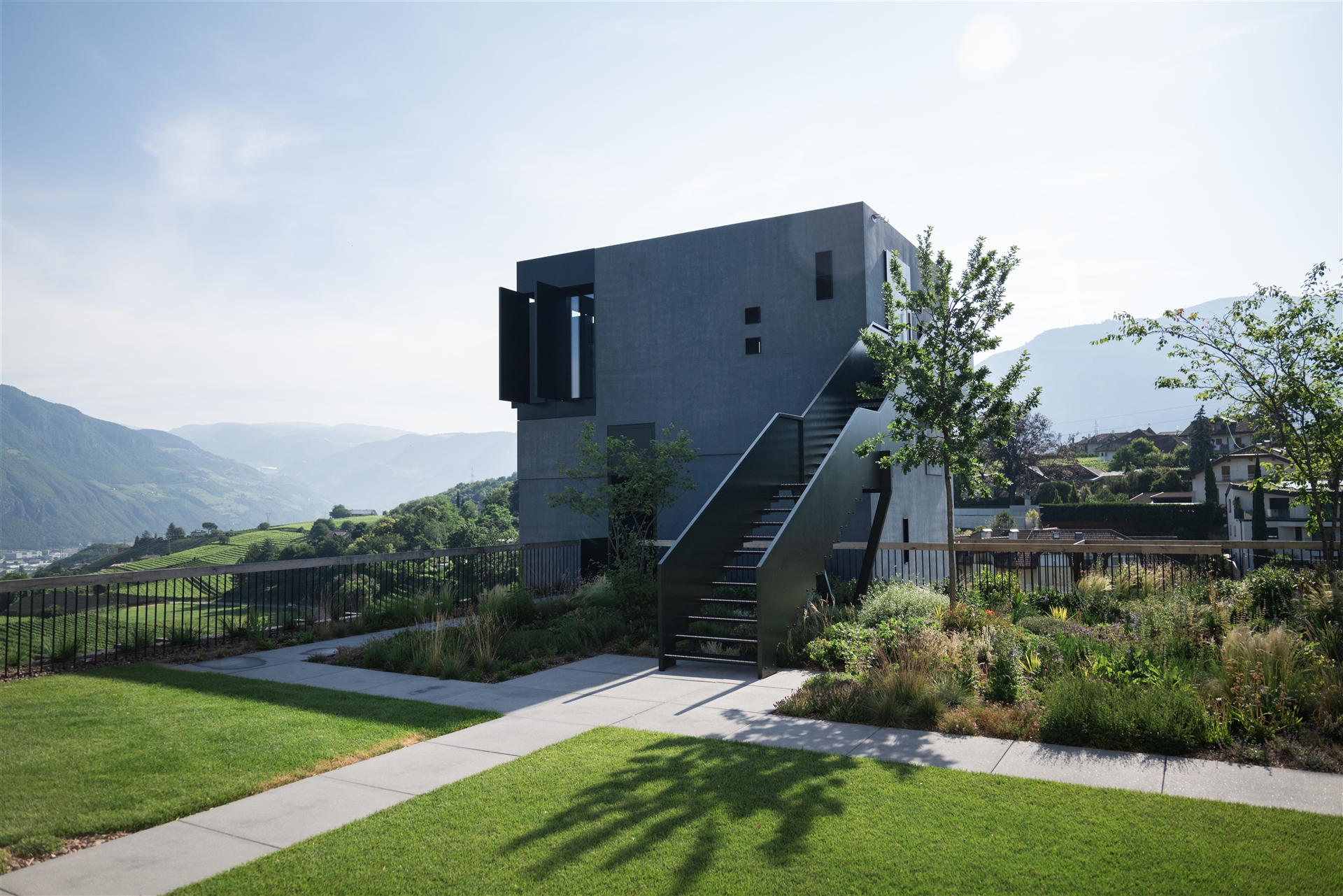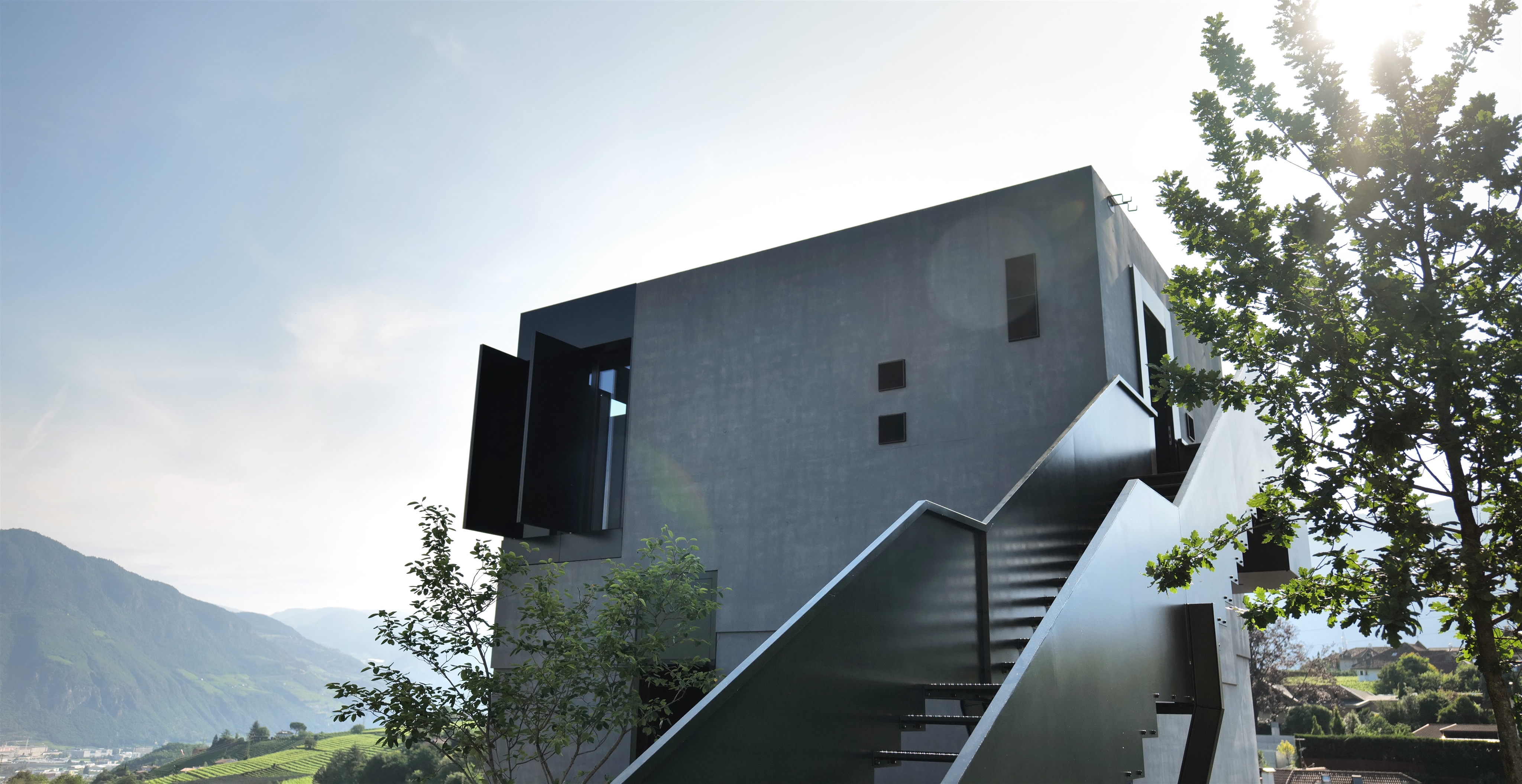 Innentreppe im schwarzen Turm über vier Geschosse aus Stahlblech mit schwebender Wirkung, rahmenlose Fixverglasungen im Verkaufsraum und Turm mit Blick über die Weinberge, öffenbare Fenster und Türen aus Glas und Aluminiumblech, Fassade des Erdgeschosses aus überdimensionalen Pfosten-Riegel-Profilen, motorisierte Klappläden mit verstecktem Antrieb, vorgesetzte Streckmetallverkleidung aus pulverbeschichtetem Aluminium, über 60 Zierelemente aus massivem Eichenholz, automatische Schiebetüren zu den Verkaufsräumen, auflastgehaltenes Stahlgeländer mit Eichenhandlauf, Lebenslinie auf dem Dach, diverse Schlosserarbeiten wie Schachtabdeckungen, Kaminverkleidungen, Stahltüren und Geländer.