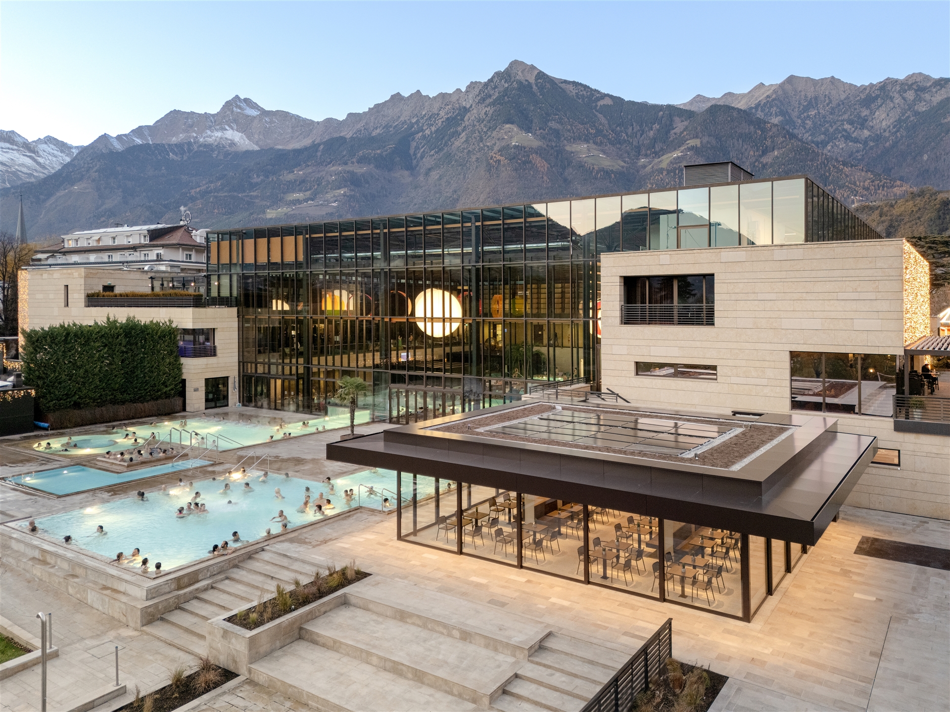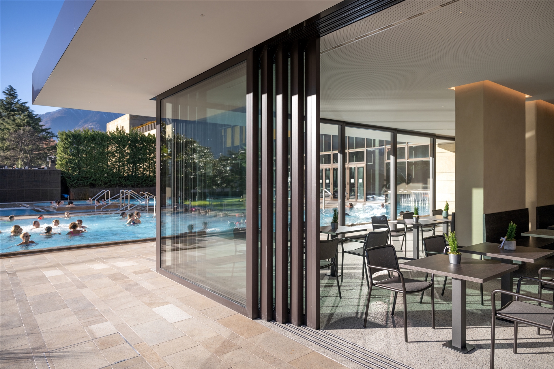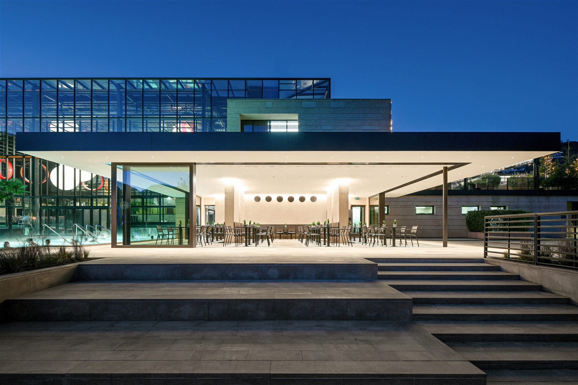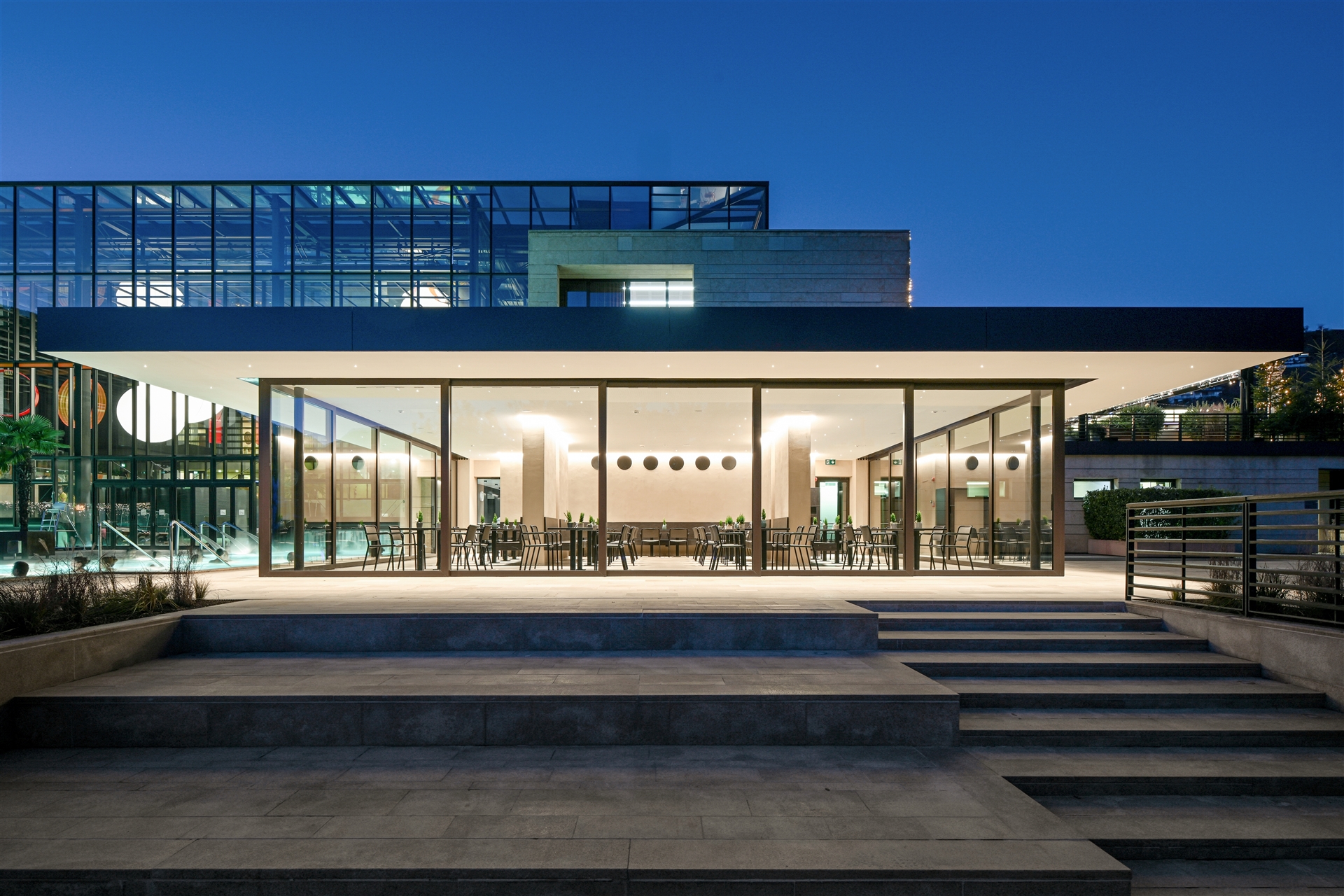 Die elegante Struktur ersetzt den alten Pavillon und öffnet den Gastronomiebereich hin zu Park und Pool. Getragen von vier schlanken Säulen, lassen große Glasfronten das Licht frei hereinströmen und verwandeln den Raum je nach Jahreszeit: wohlig geschützt im Winter, weit geöffnet im Sommer. Über allem schwebt ein begrüntes Dach mit Photovoltaikanlage, das Nachhaltigkeit sichtbar macht. Aluminium in warmer Brünierung, wasserfester Stein und edle Details verbinden Beständigkeit mit Eleganz. Innen sorgt das Spiel aus sanfter Beleuchtung und stilvollen Möbeln für eine Atmosphäre, die gleichermaßen raffiniert wie einladend ist. Ein Raum, der das Verweilen zum Genuss macht.