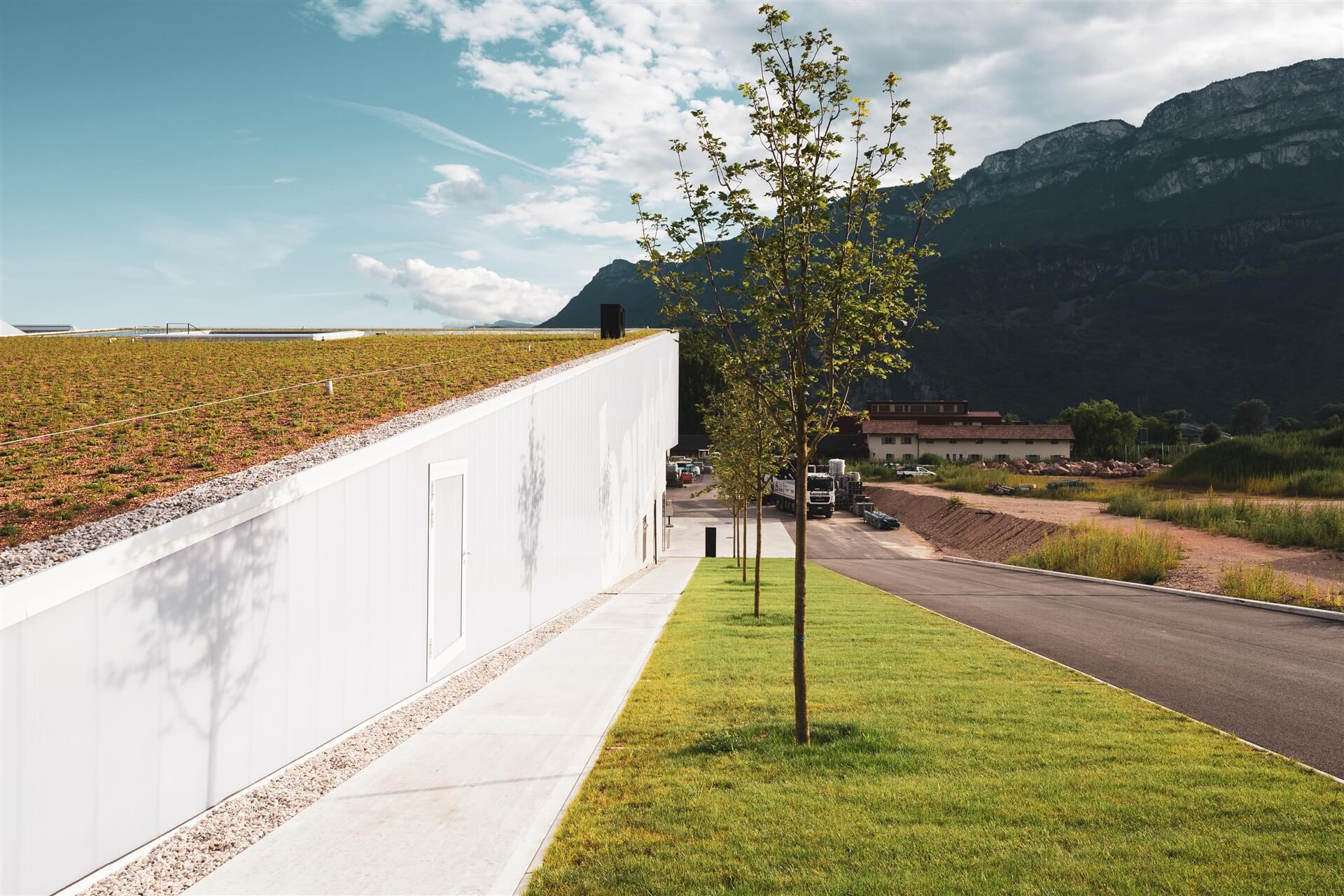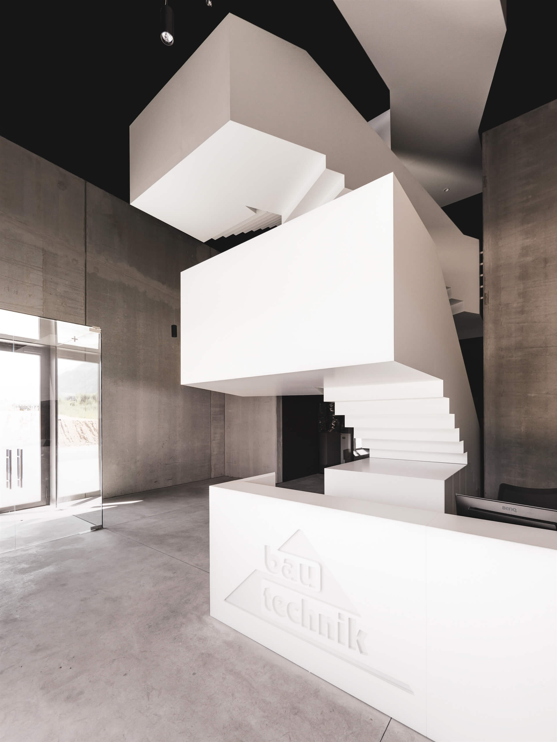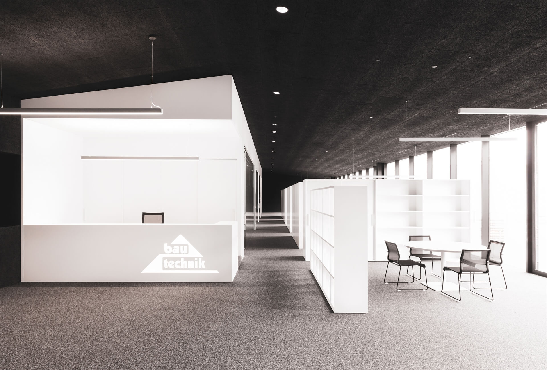 Der neue Headquarter der Firma Bautechnik wächst sanft aus dem grünen Boden heraus und zeigt sich schließlich in voller Größe mit großzügigem An- und Abtransportbereich, weiter Glasfront und offenem Warenlager.