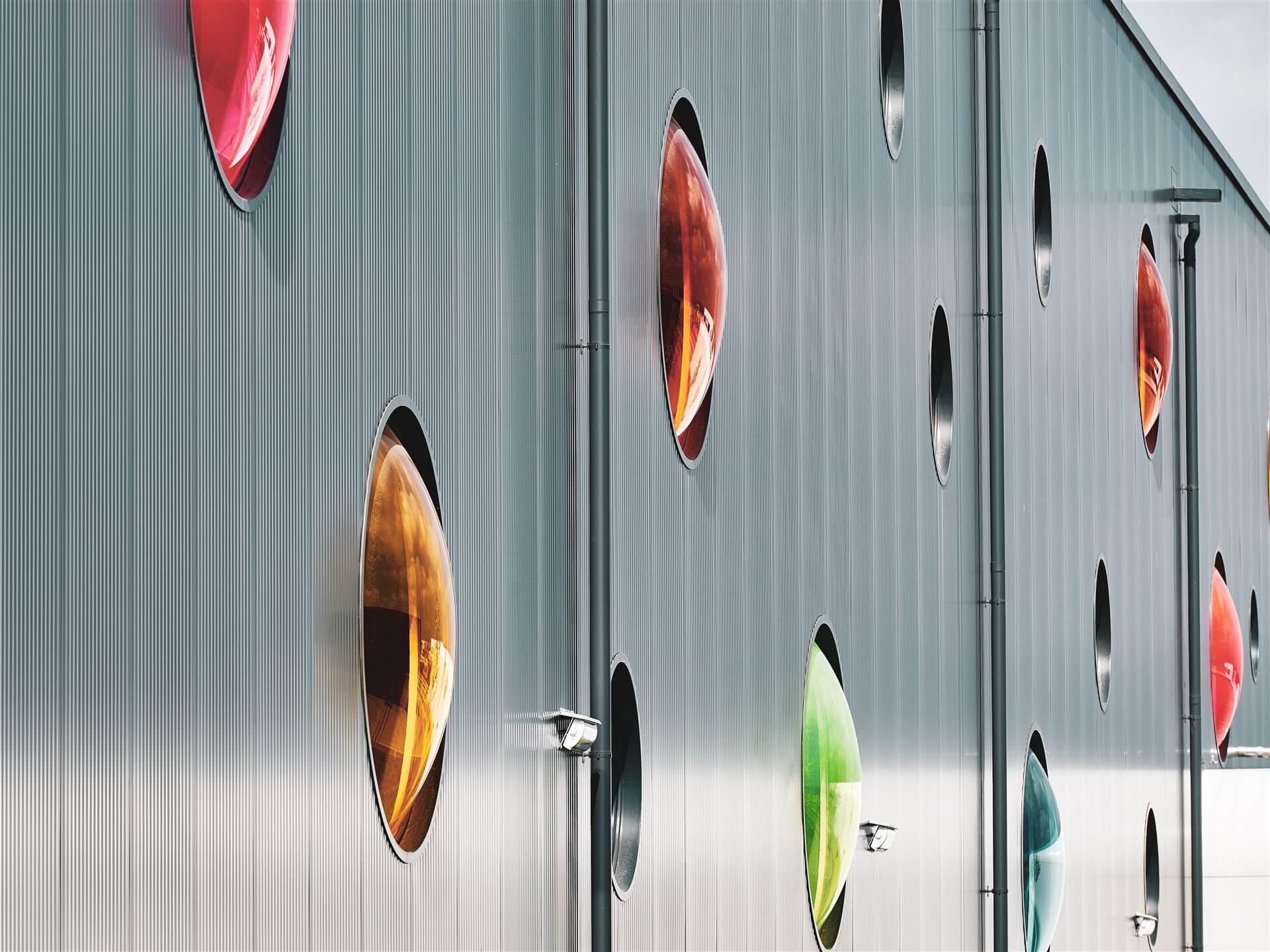 Kurze Ausführungszeit, radial Gebogene Alu-Verbundplatten, Unregelmäßige Anordnung der kreisrunden Fenster, verschiedene Durchmesser der kreisrunden Fenster, verschiedenfarbige Gläser.