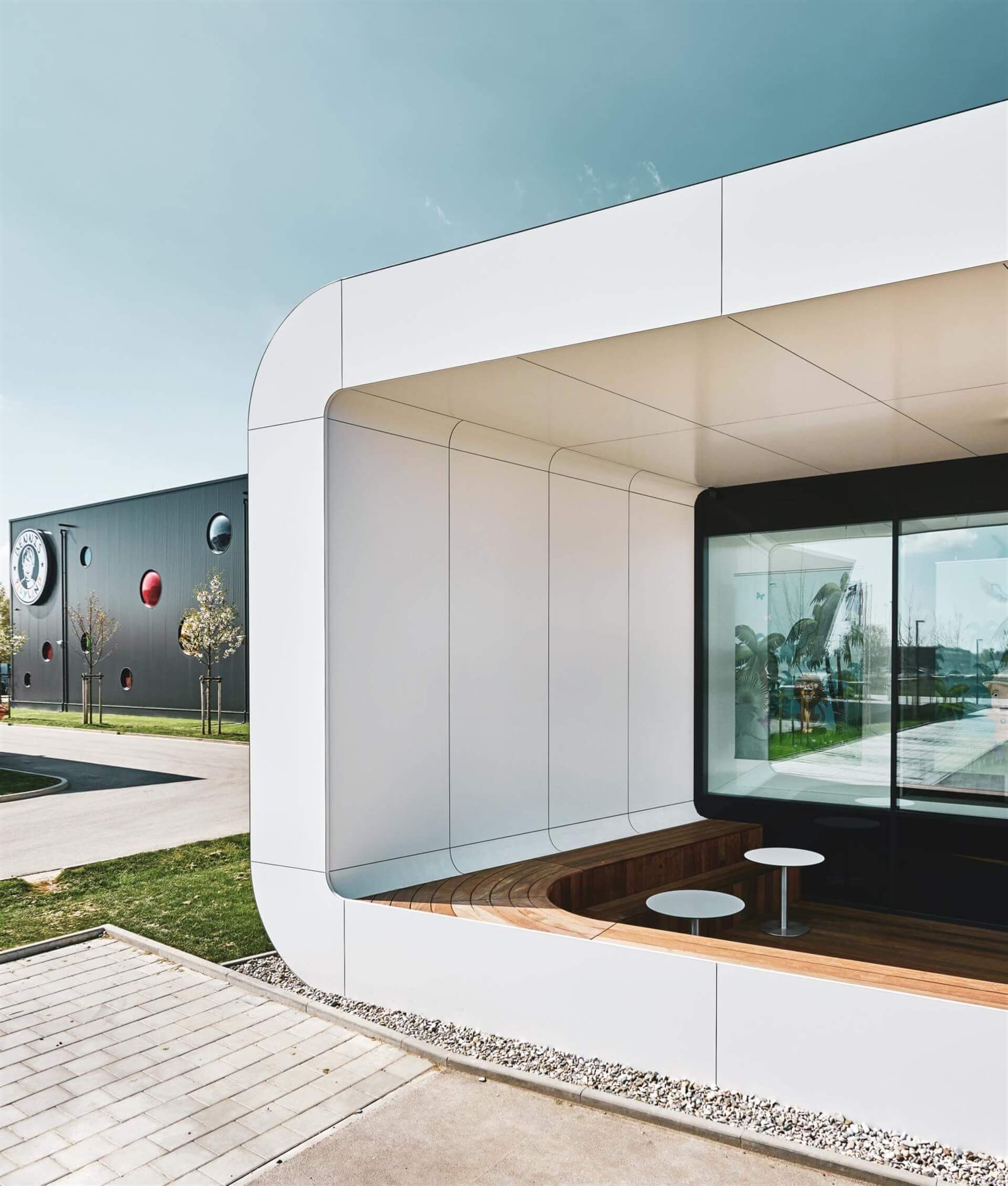 25t Stahlkonstruktionen, 2500m² Fassade aus Sandwichpaneelen, 500m² Alu-Verbundplatten, 56 Stk. kreisrunde Fenster, 120m² Glasfassade.