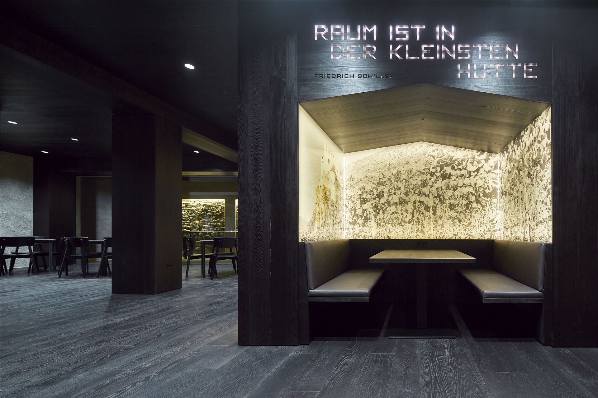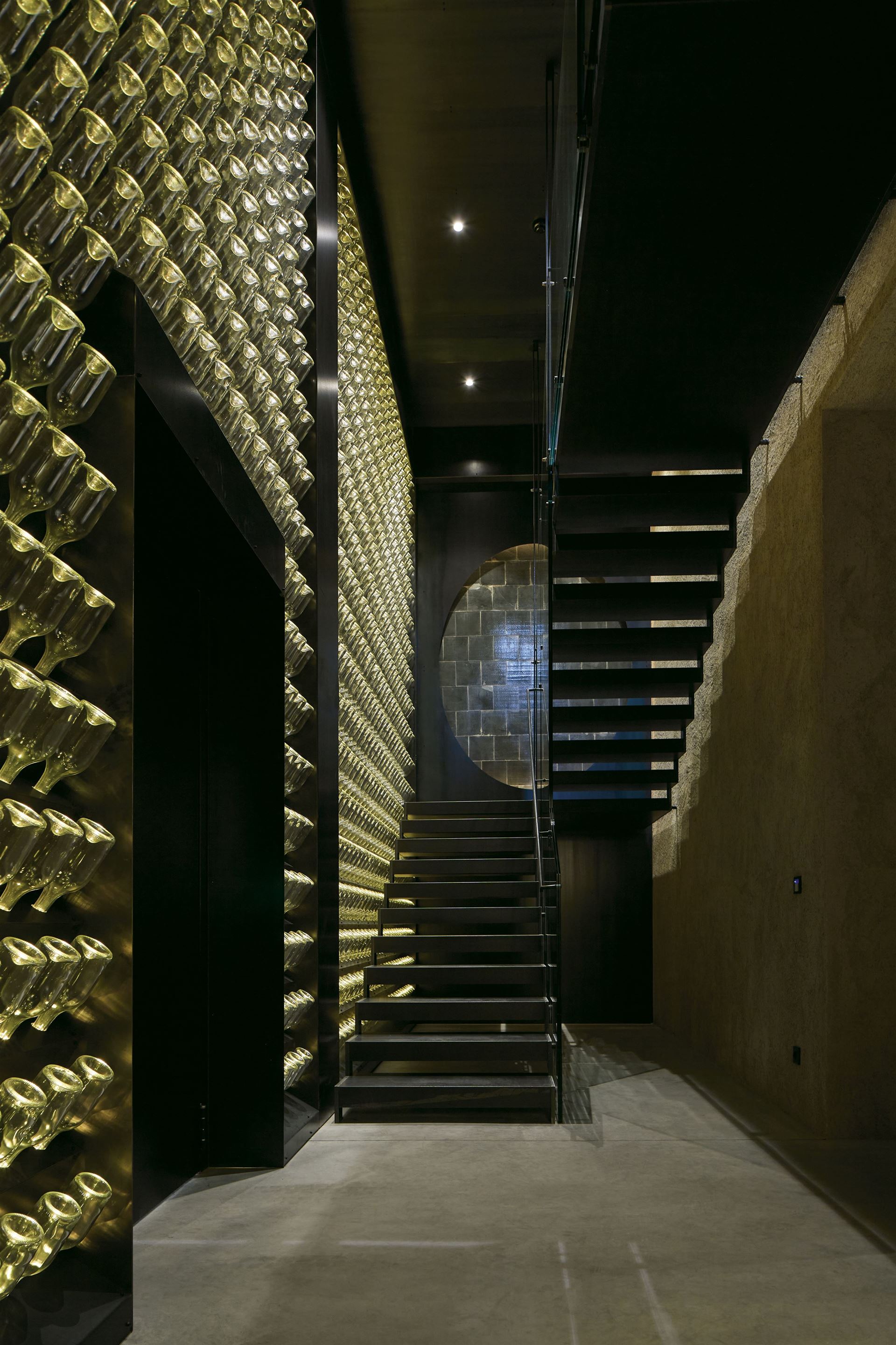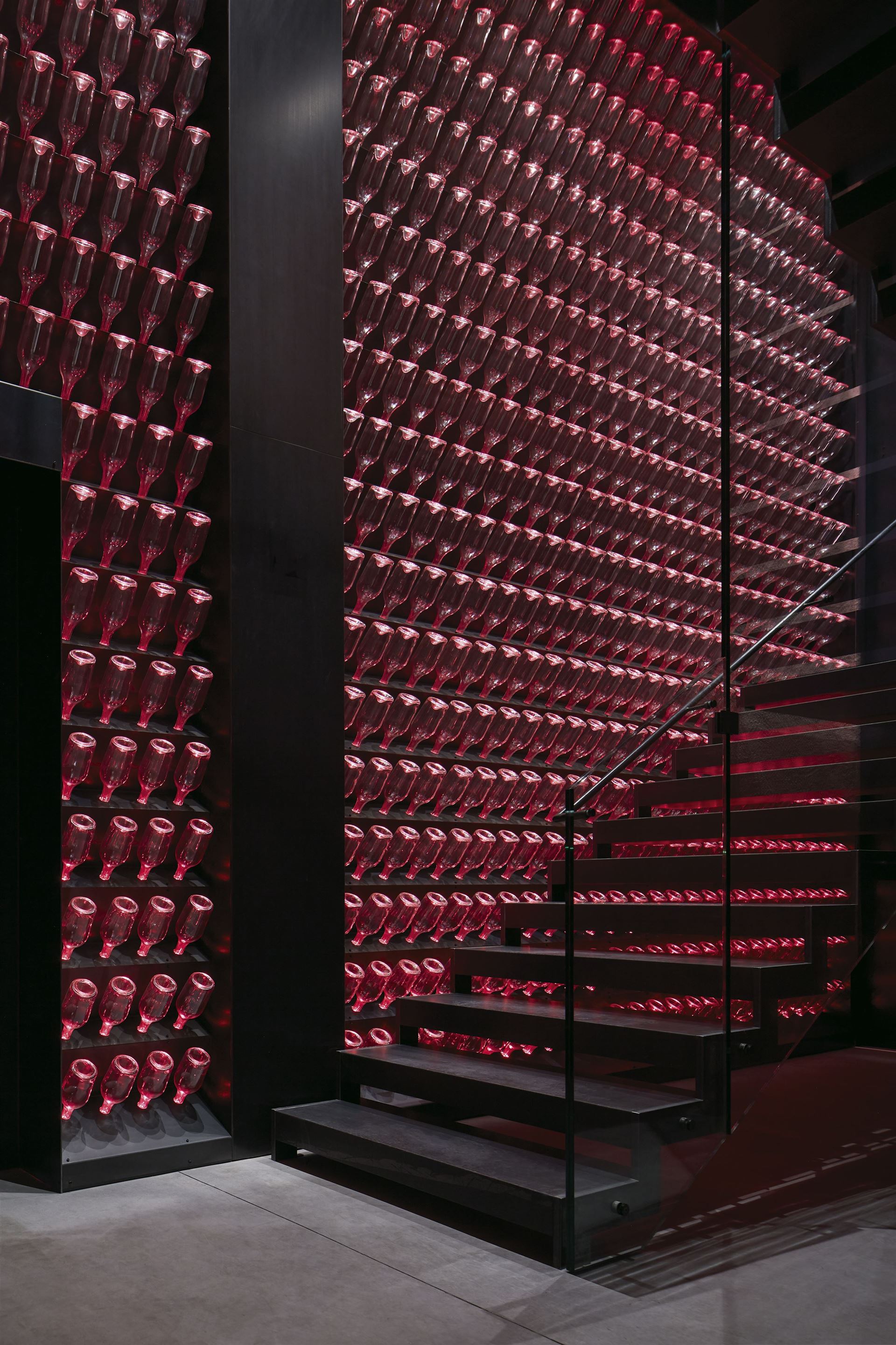 Wie wichtig dem Architekten die Kombination von Licht und schwarzem Stahl war, zeigt sich an zahlreichen Details, wie der individuell beleuchtbaren "Flaschenwand" über zwei Stockwerke, dem filigranen Treppenhandlauf mit integrierter LED-Beleuchtung und den hinterleuchteten Schriftzügen in der Fassade.