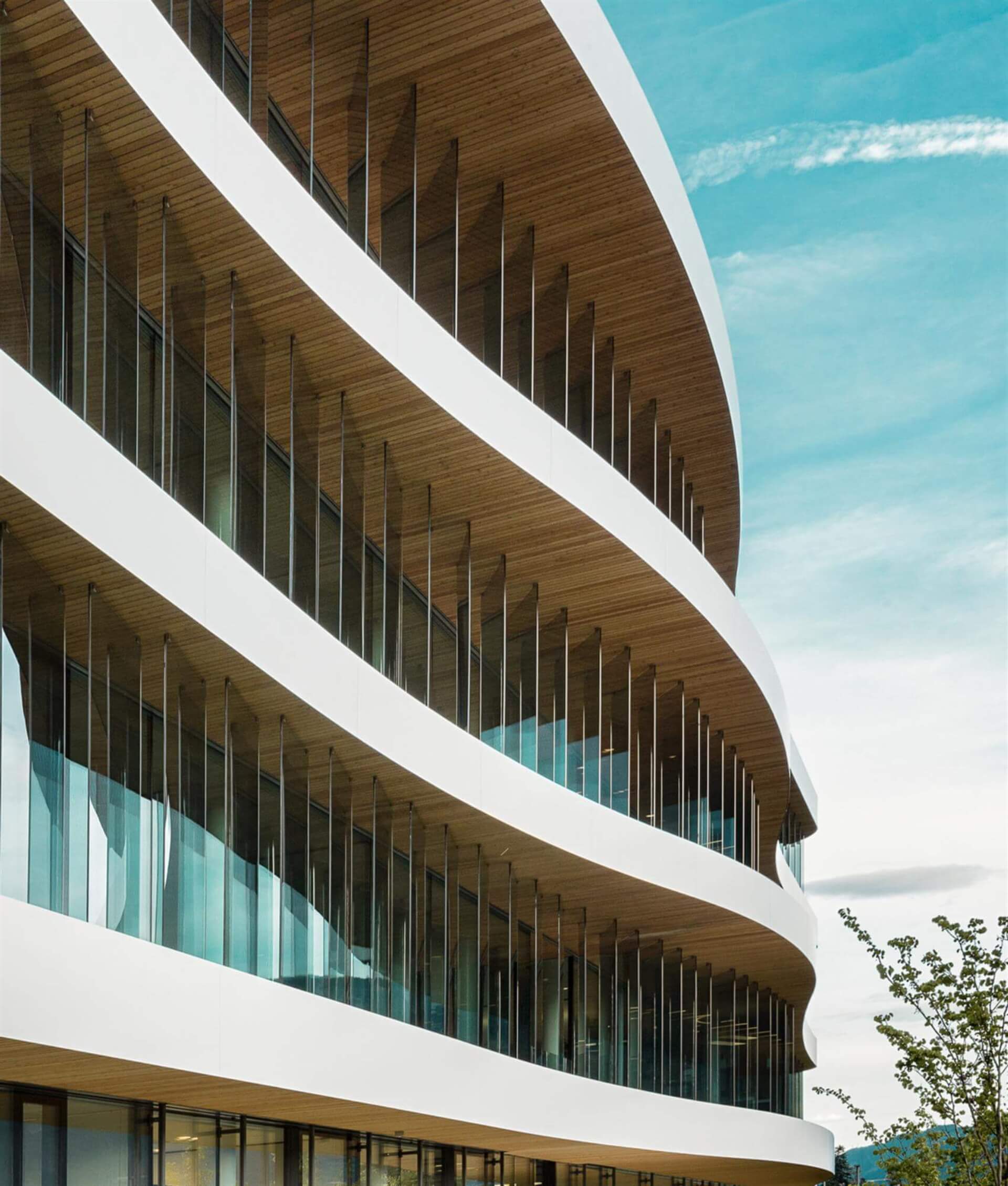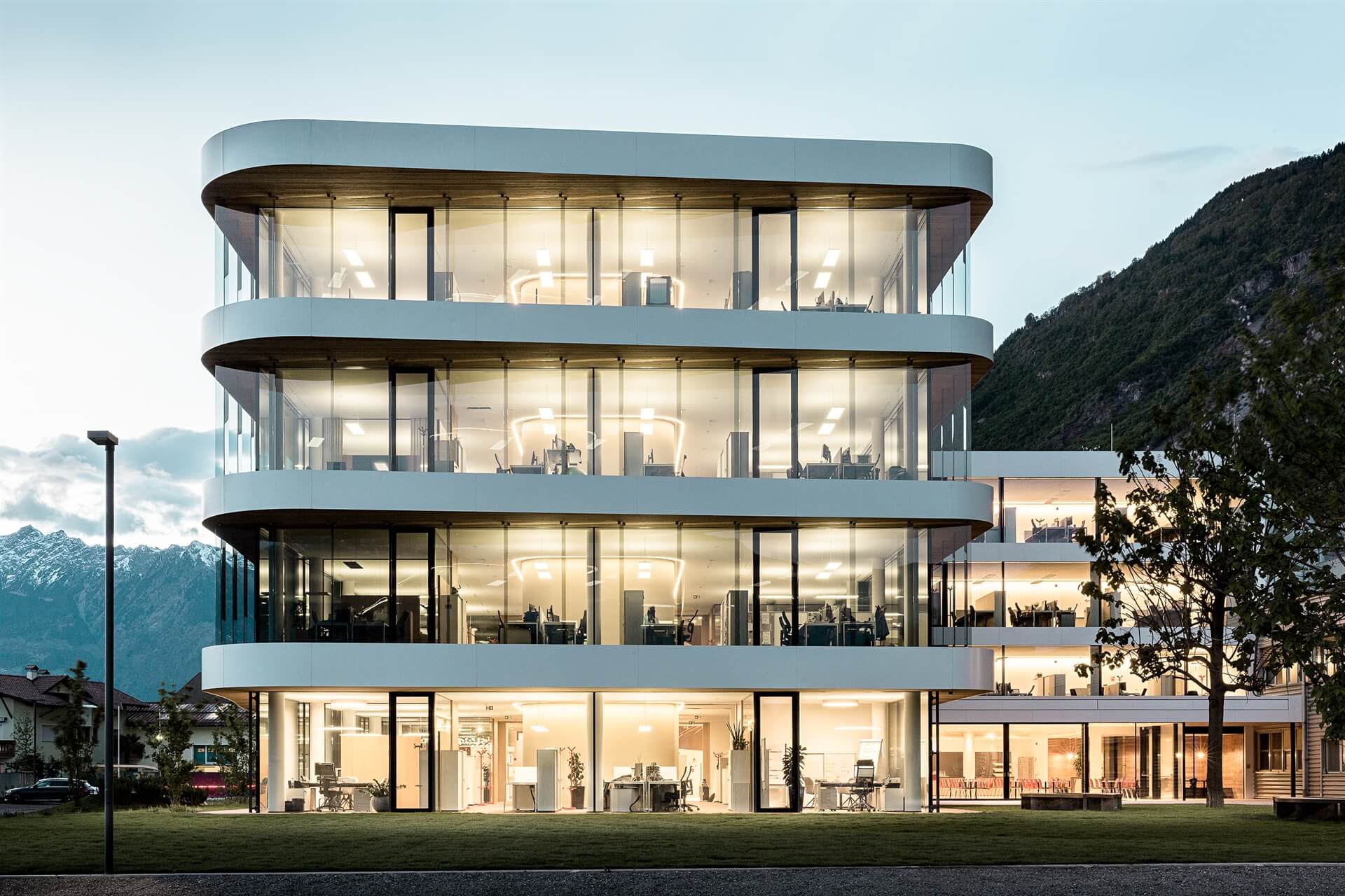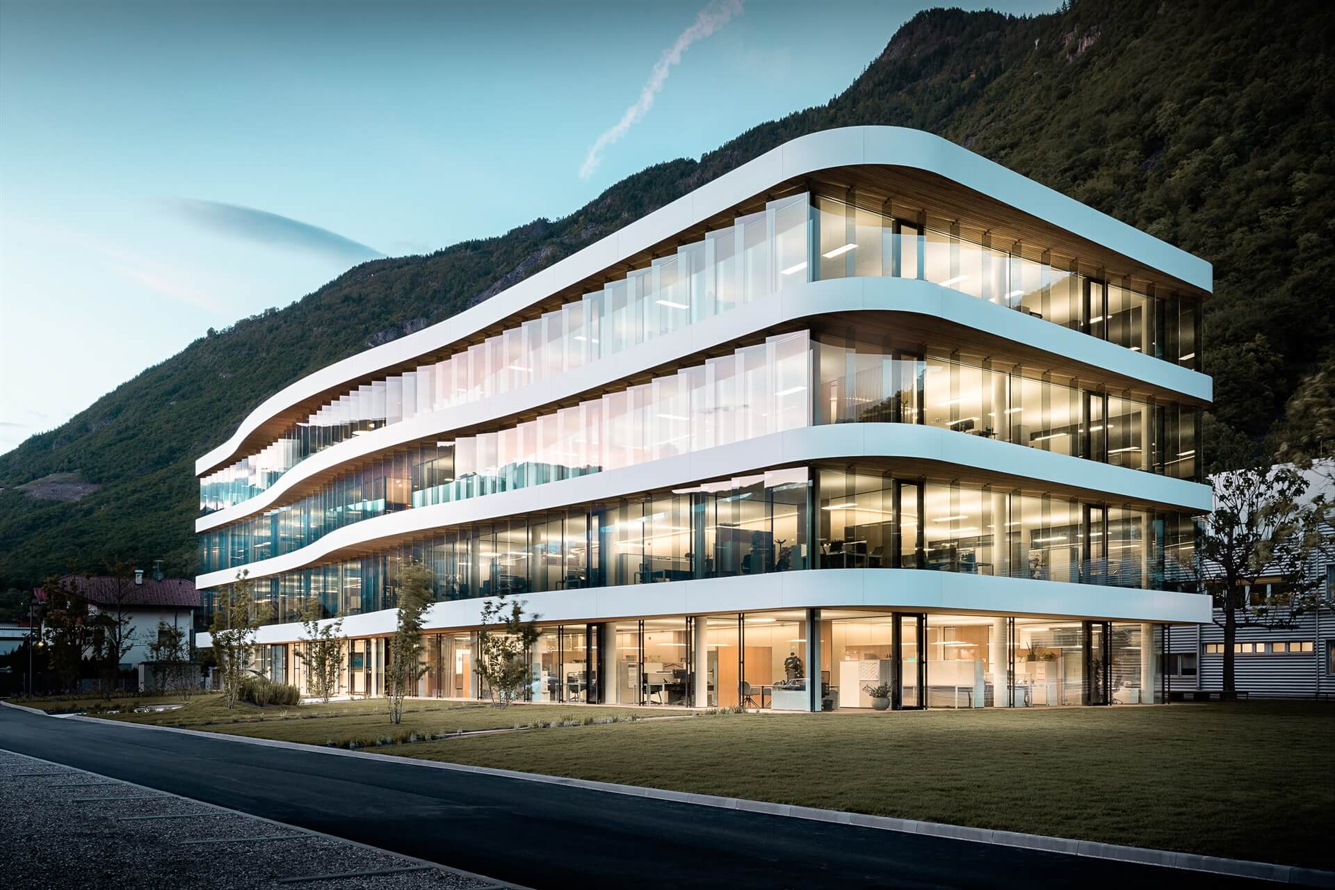 Weich geschwungene Ebenen geben dem Bürogebäude der Firma Dr. Schär seine Form. Weiße Aluminiumblenden führen die Linien des Baus mit harmonischem Schwung in die Horizontale.