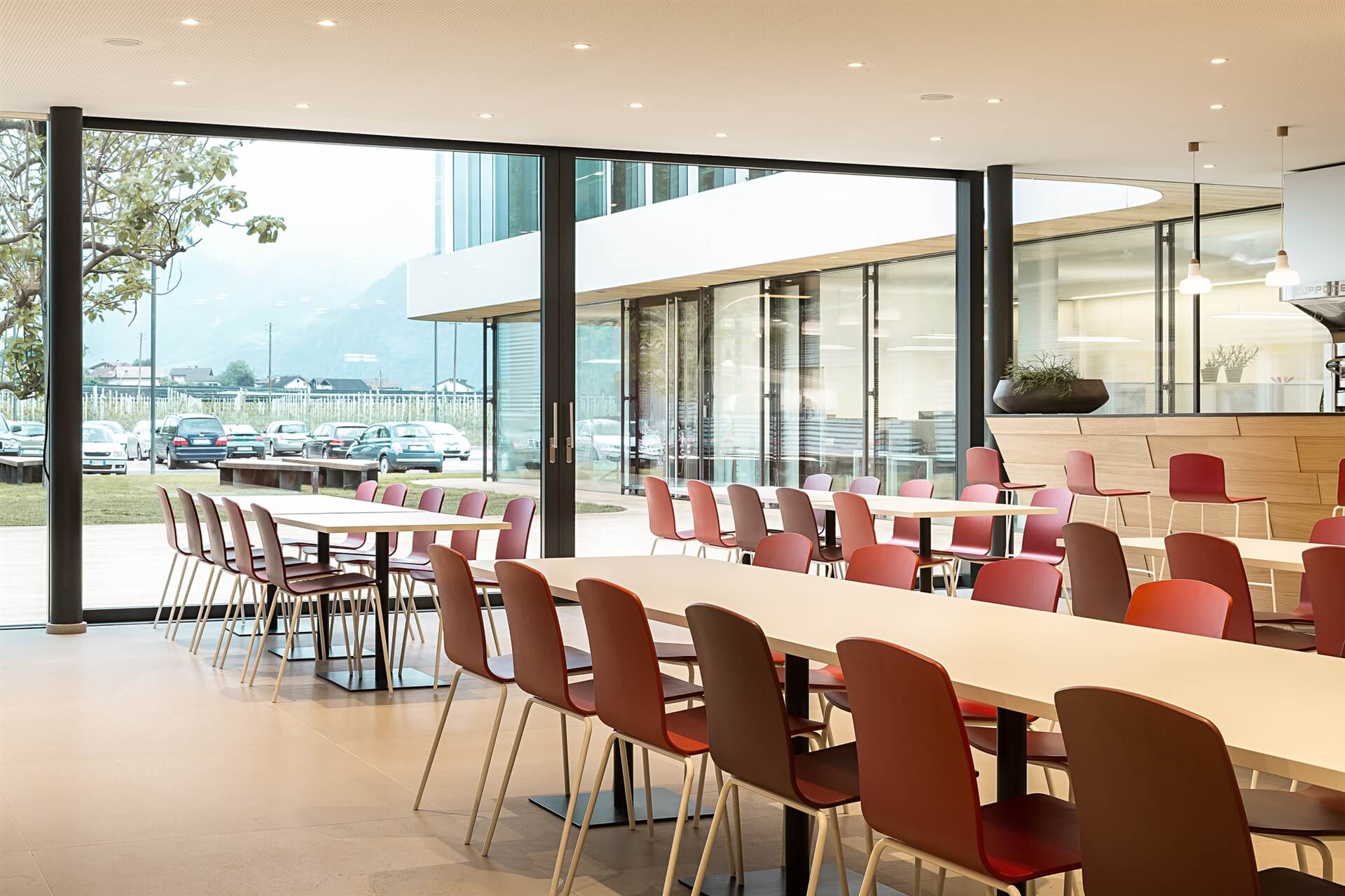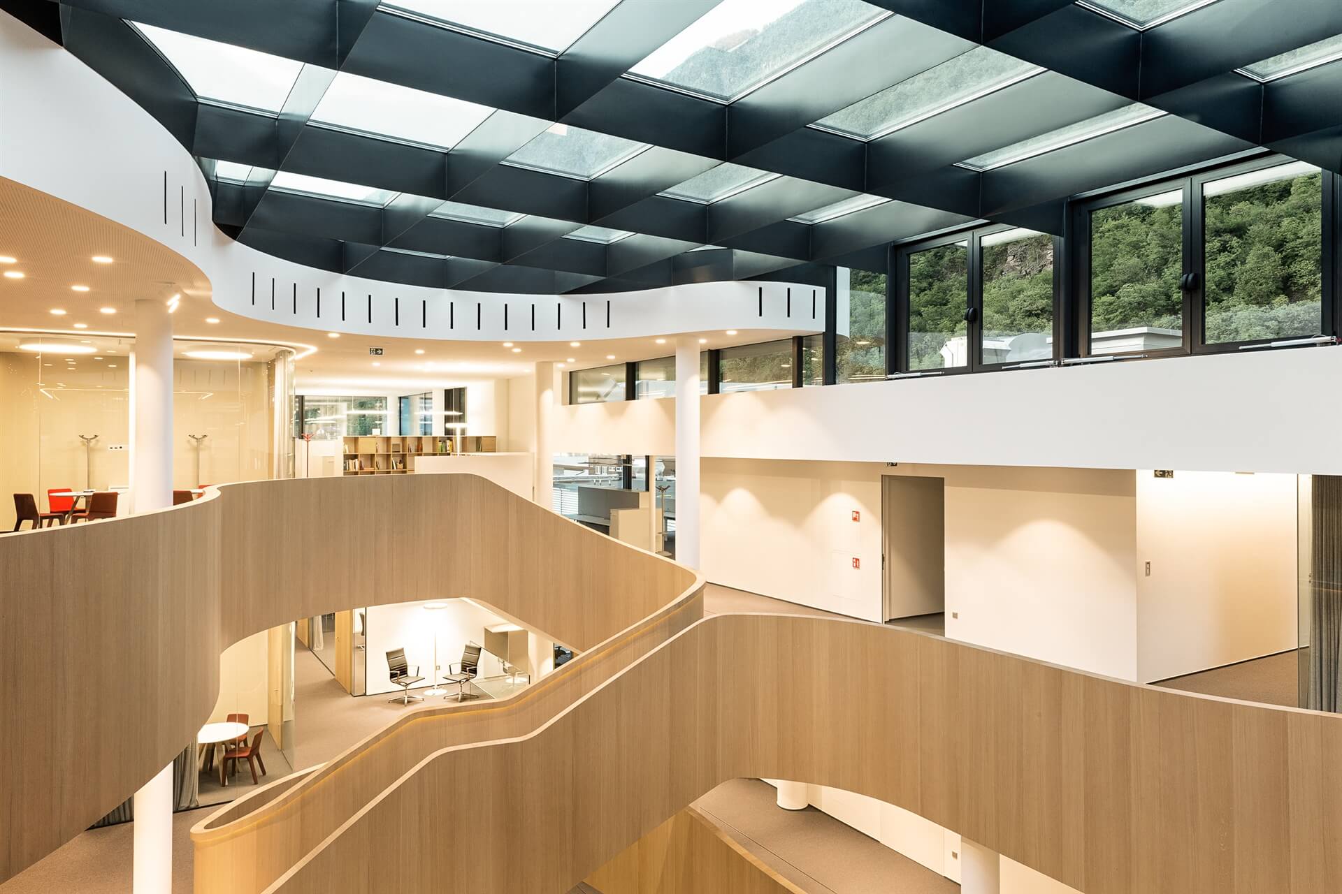 Die lichtdurchfluteten Innenräume schaffen ein freundliches, motivierendes Arbeitsklima. Zum Einsatz kam großflächig helles, eisenoxidarmes Glas, während lamellenförmig angeordnete Prallgläser in variierenden Winkeln vor Überhitzung schützen. Ein bauliches Highlight war für uns die flexibel konzipierte Südfassade: Sie lässt sich im Falle einer Erweiterung vollständig demontieren und wieder aufbauen.