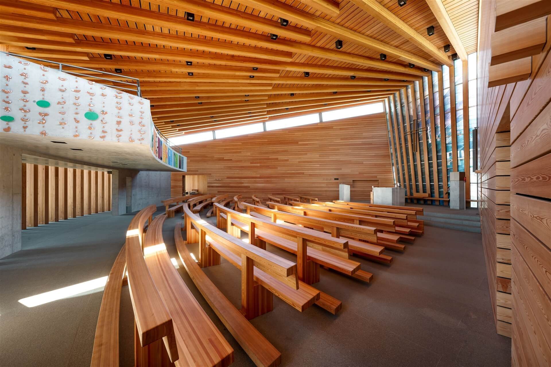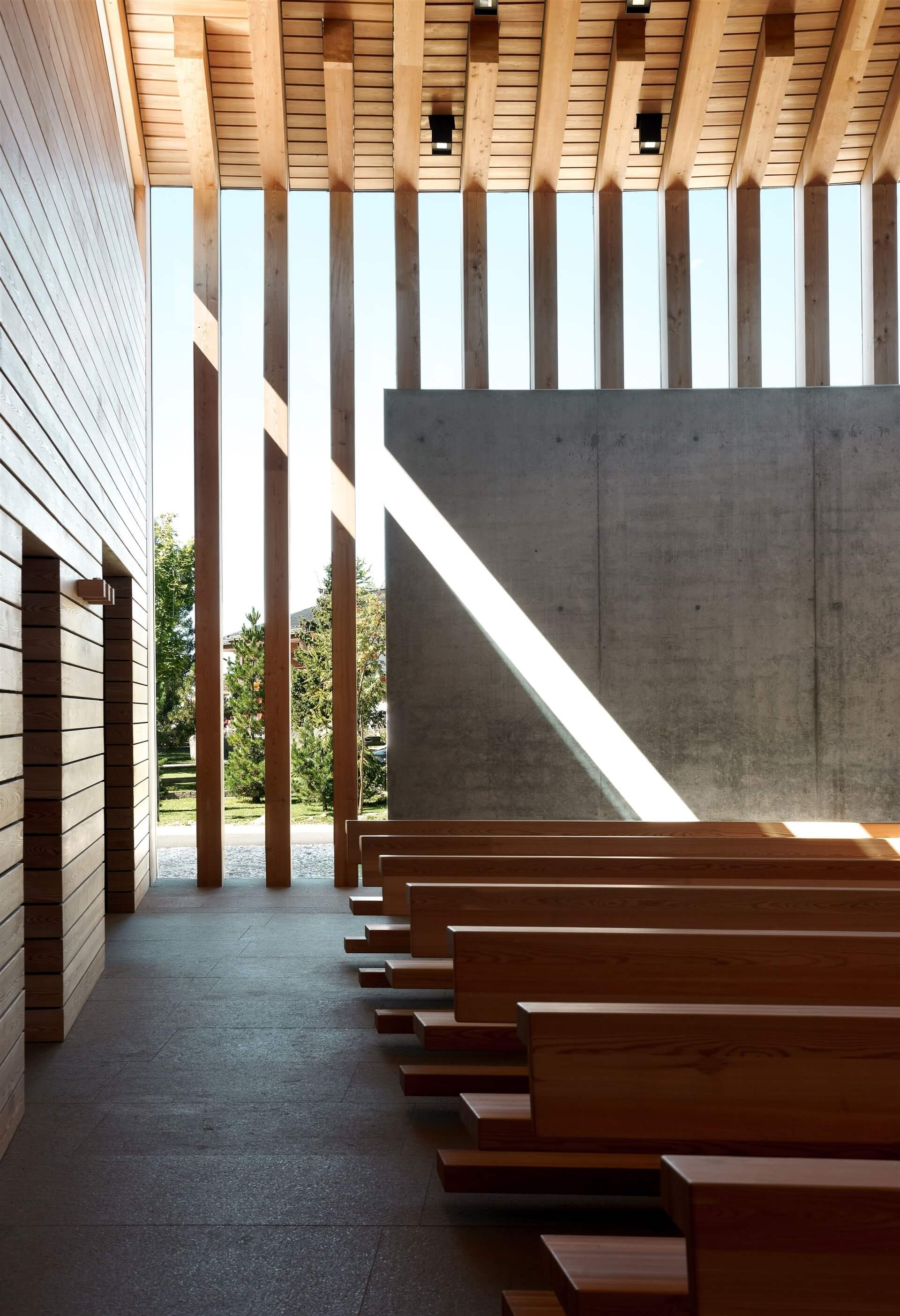 Wie eine Taube thront die neue Franziskuskirche auf der Seiser Alm. Dementsprechend filigran sind die Holzkonstruktionen ausgefallen.