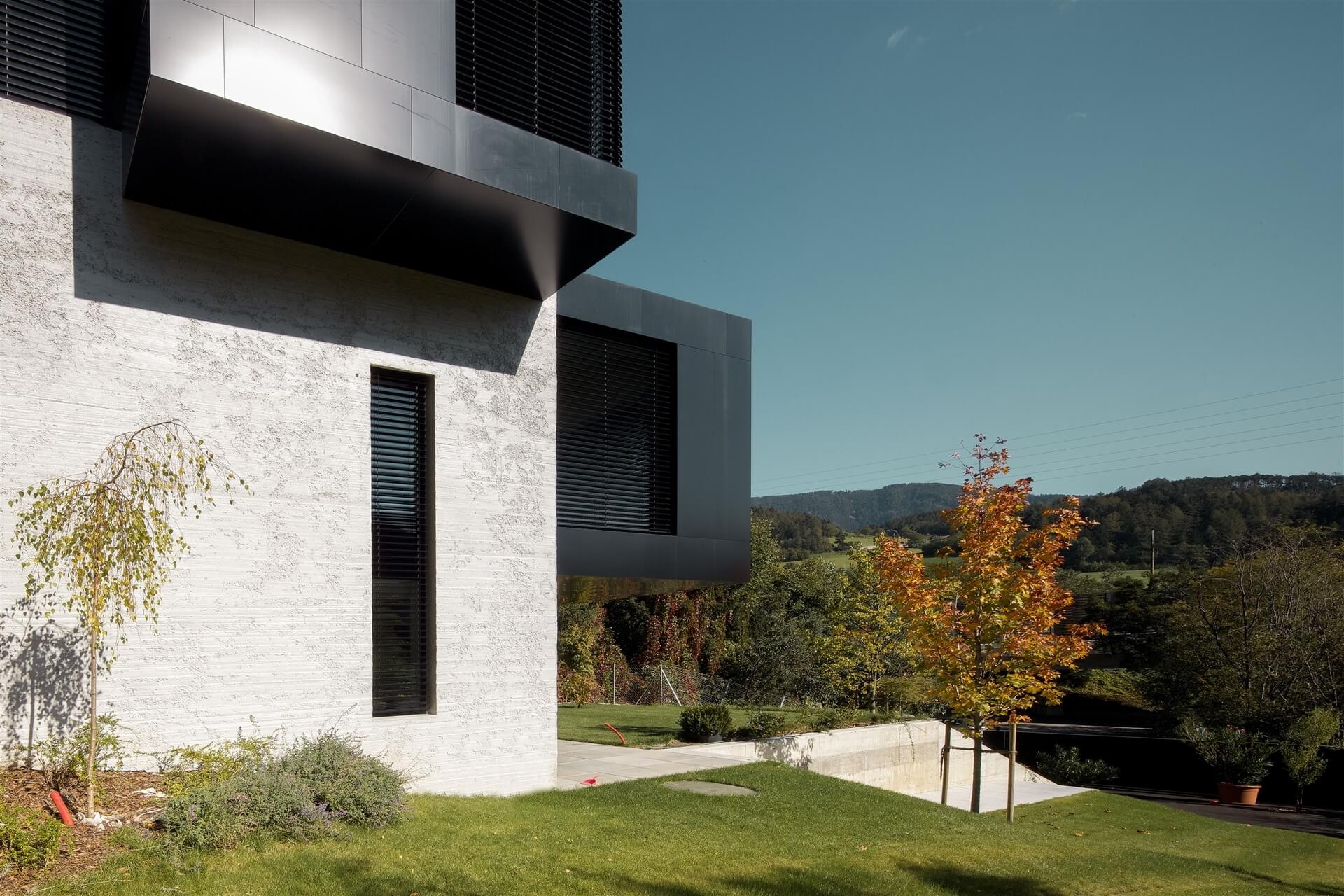 Außenabschlüsse mit 3-fach Isolierverglasung, Unterkonstruktionen und Verkleidungen aus Aluminiumverbundplatten, Ausbildung von Ganzglasecken, automatisches Einfahrtstor