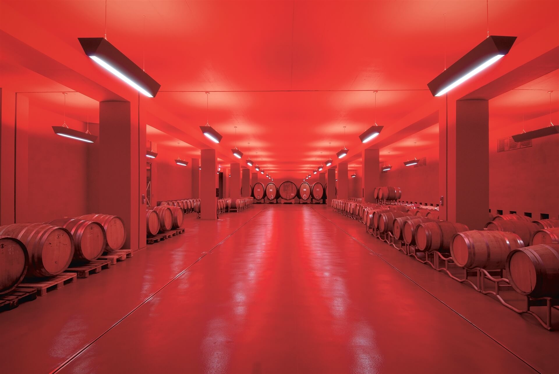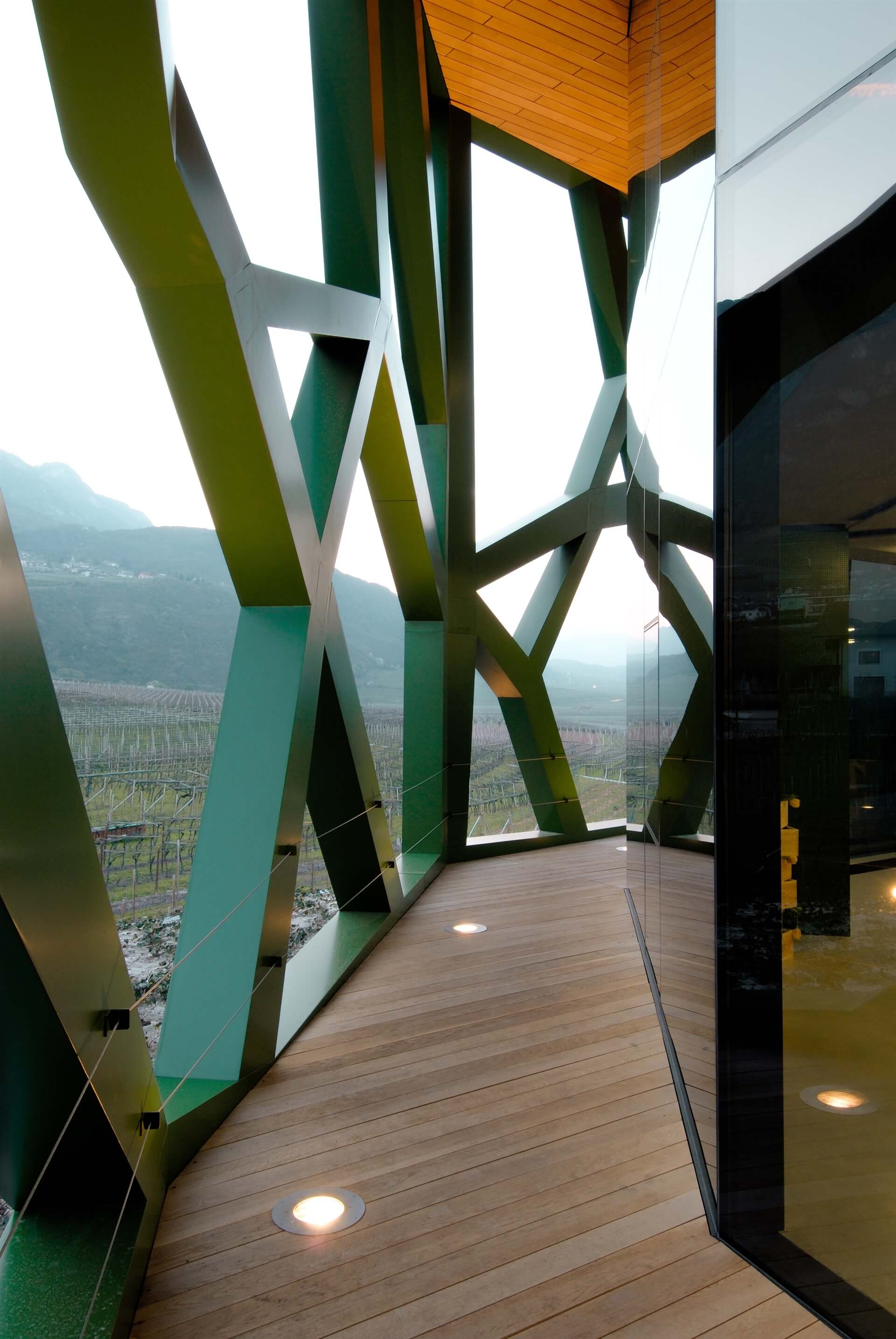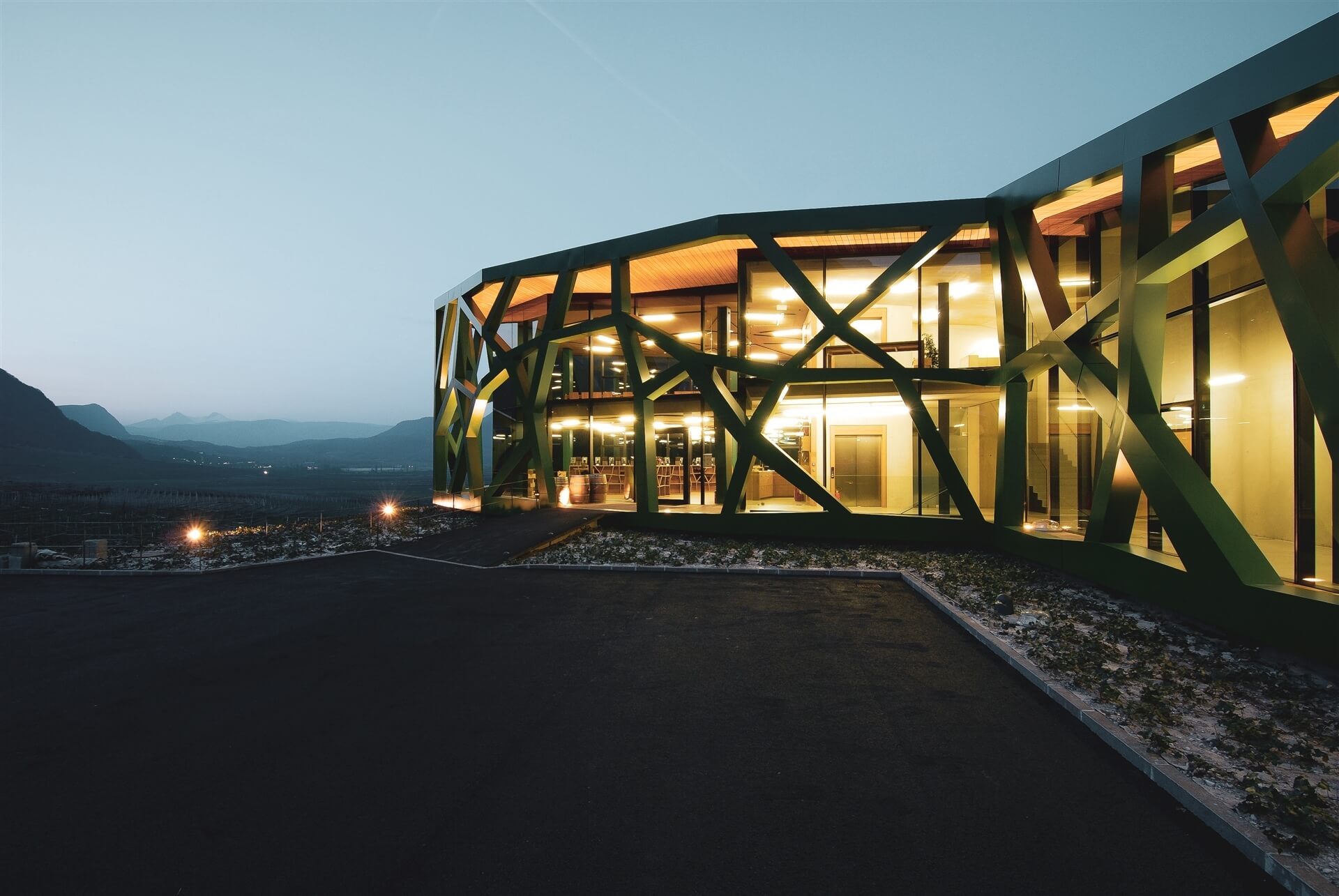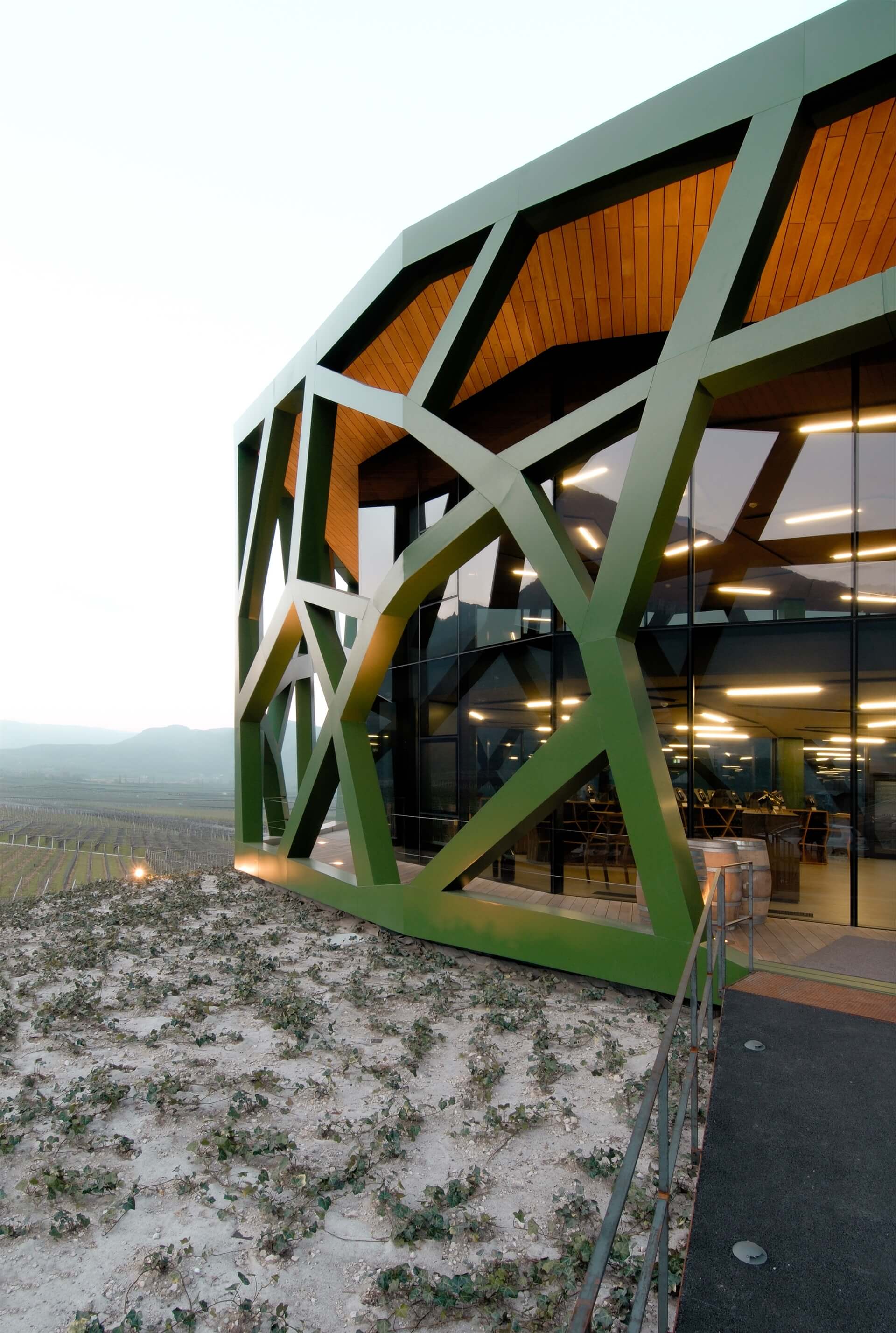 Die Fassade der neuen Kellerei in Tramin webt sich phantasievoll in die umgebenden Weinberge ein.