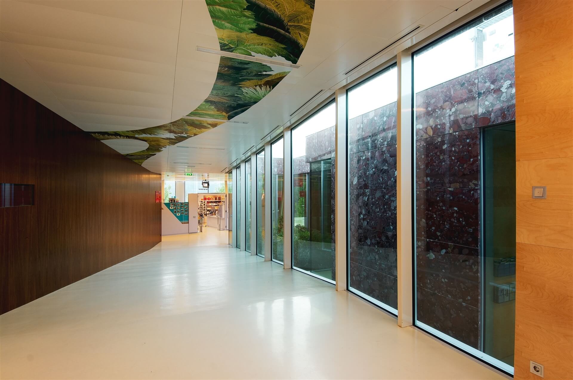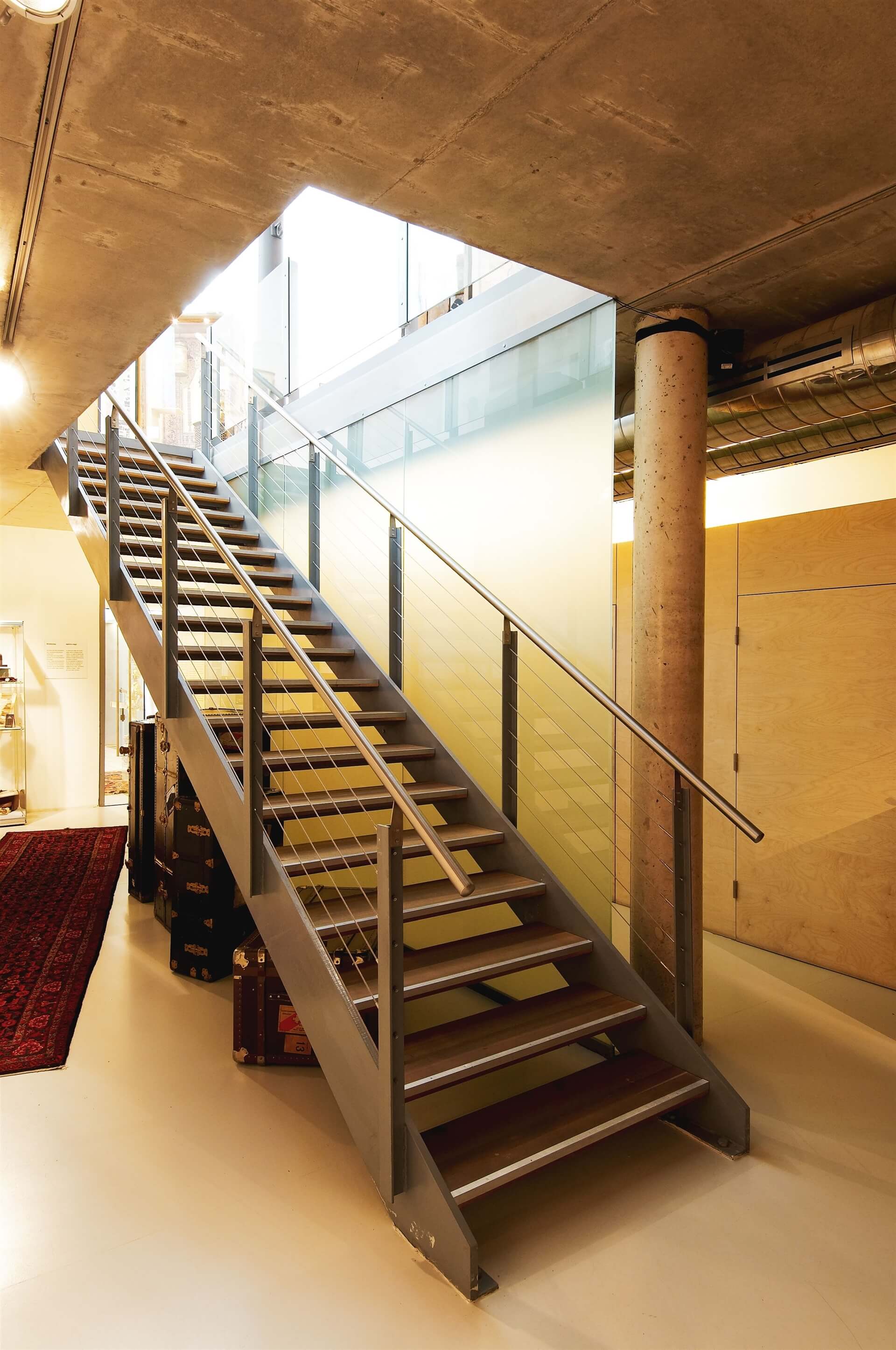 Die Stahl und Glasfassade sowie die Aufzugstürme aus verzinktem Stahl und Glas wurden von den Architekten respektvoll im Ensemble eingebettet. Eine besondere Herausforderung war die Anbringung und flexible Lagerung der übergroßen, 4 Meter hohen Glasscheiben. Diese schwierige
