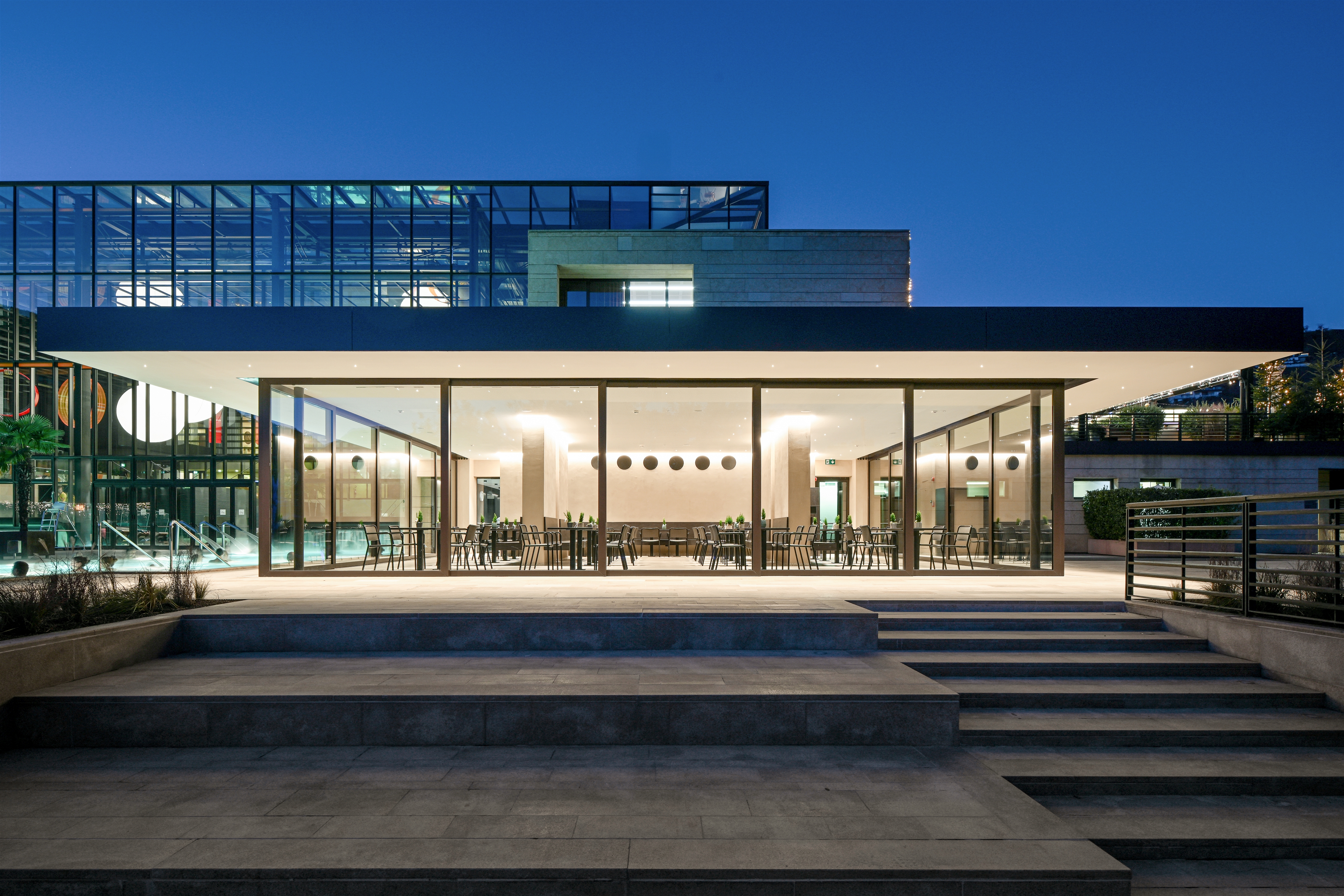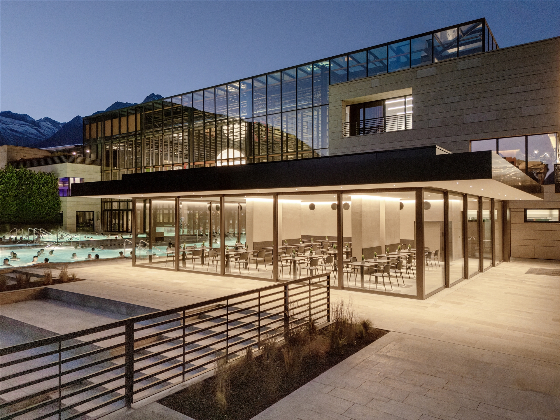 La struttura elegante sostituisce il vecchio padiglione, aprendo l’area gastronomica verso il parco e la piscina. Quattro snelle colonne sorreggono ampie vetrate che lasciano filtrare liberamente la luce, trasformando lo spazio con le stagioni: accogliente e protetto in inverno, luminoso e aperto in estate. Sopra tutto, un tetto verde con pannelli fotovoltaici testimonia l’impegno per la sostenibilità. L’alluminio dalla calda brunitura, la pietra impermeabile e i dettagli raffinati uniscono robustezza ed eleganza. All’interno, il delicato gioco di luci e arredi di design crea un’atmosfera al contempo sofisticata e invitante, facendo di questo spazio un vero piacere per il soggiorno.