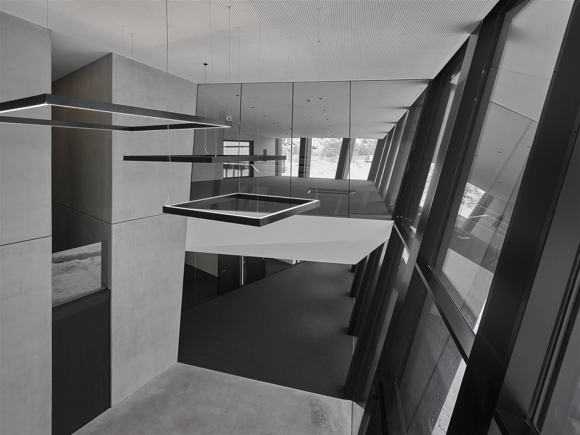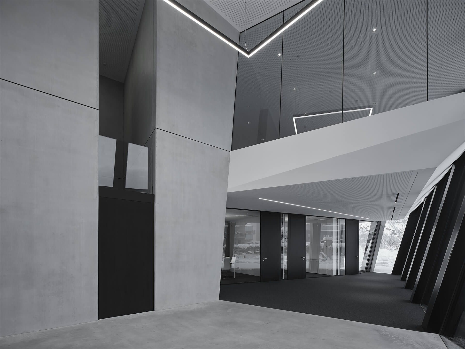 la geometria dell’edificio, con le colonne in acciaio e la facciata in vetro e rivestimento in lamiera, sono inclinate in due direzioni. A causa del breve periodo di esecuzione,tutti i componenti in acciaio, le costruzioni di facciate, nonché le vetrate isolanti e le lastre sono stati progettati e realizzati su base 3D.