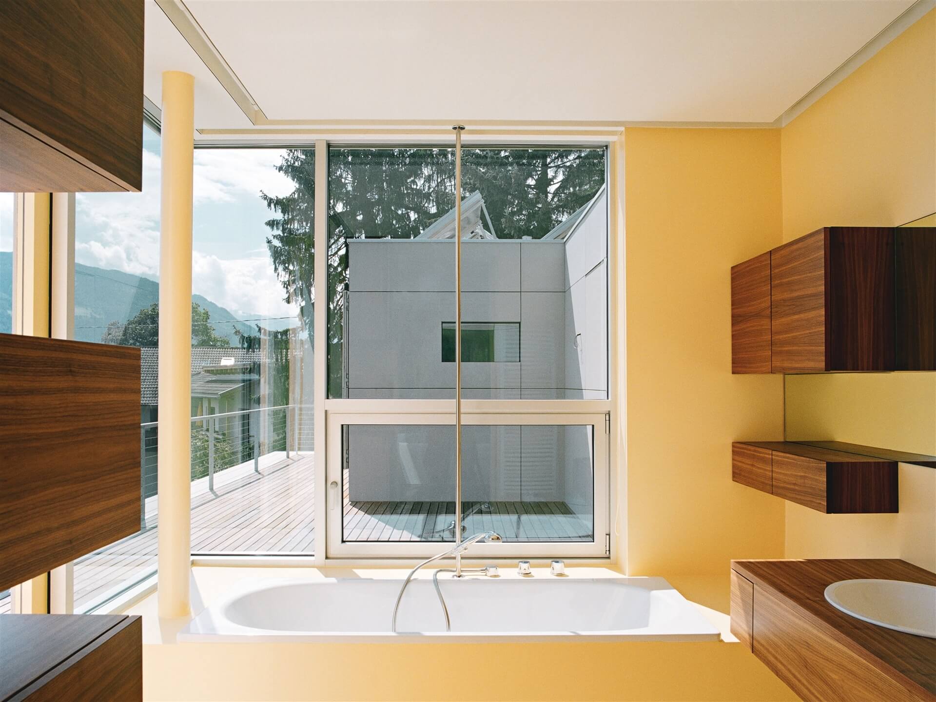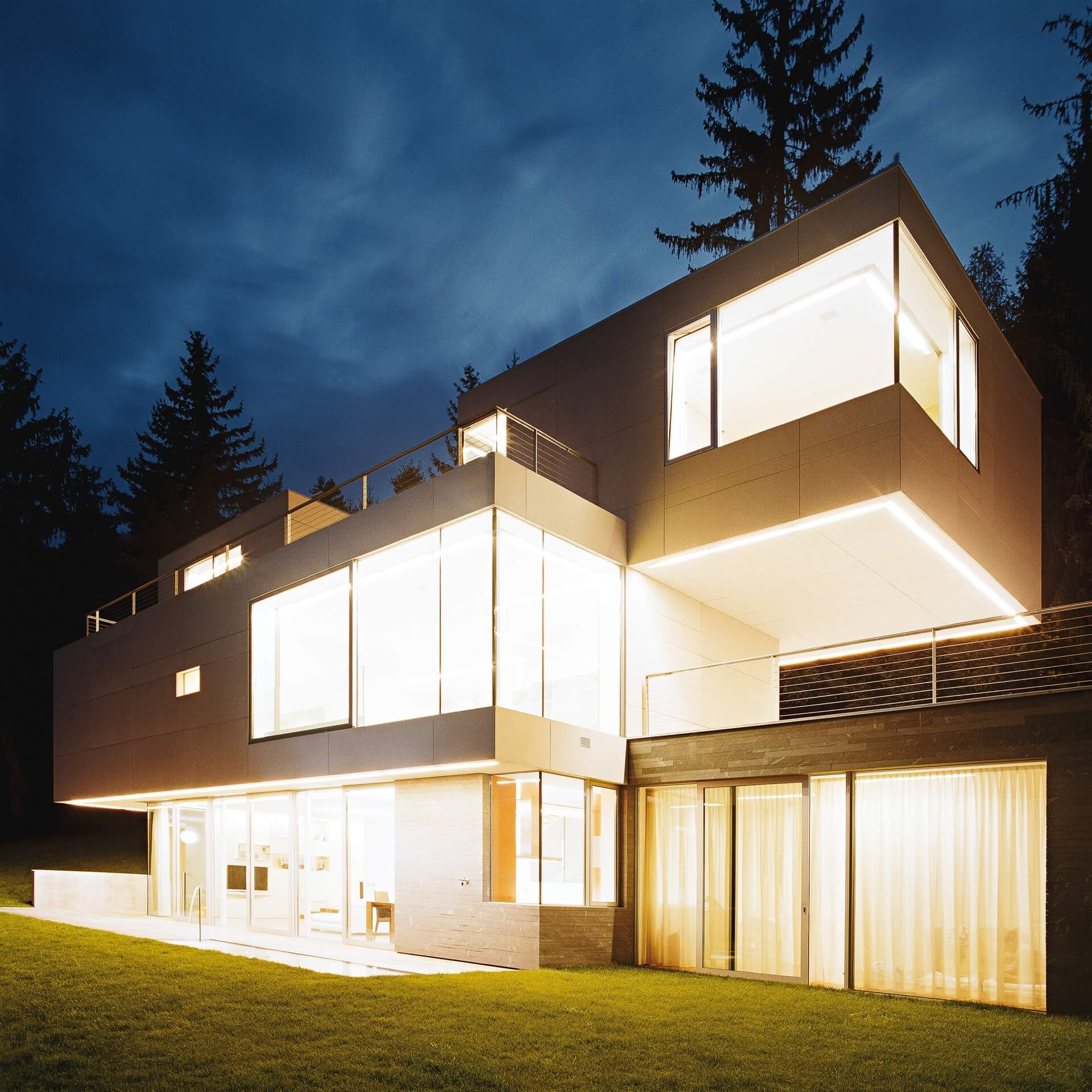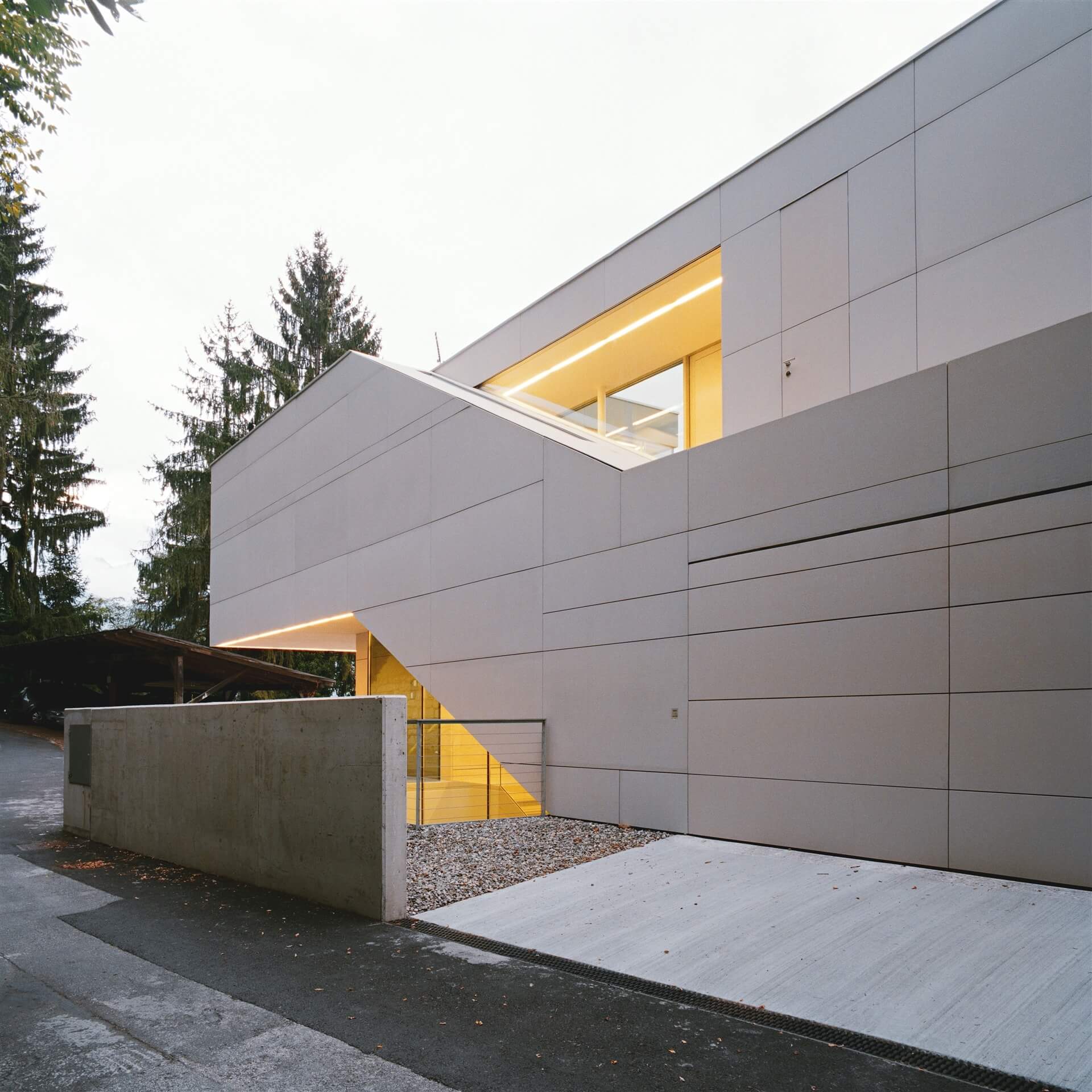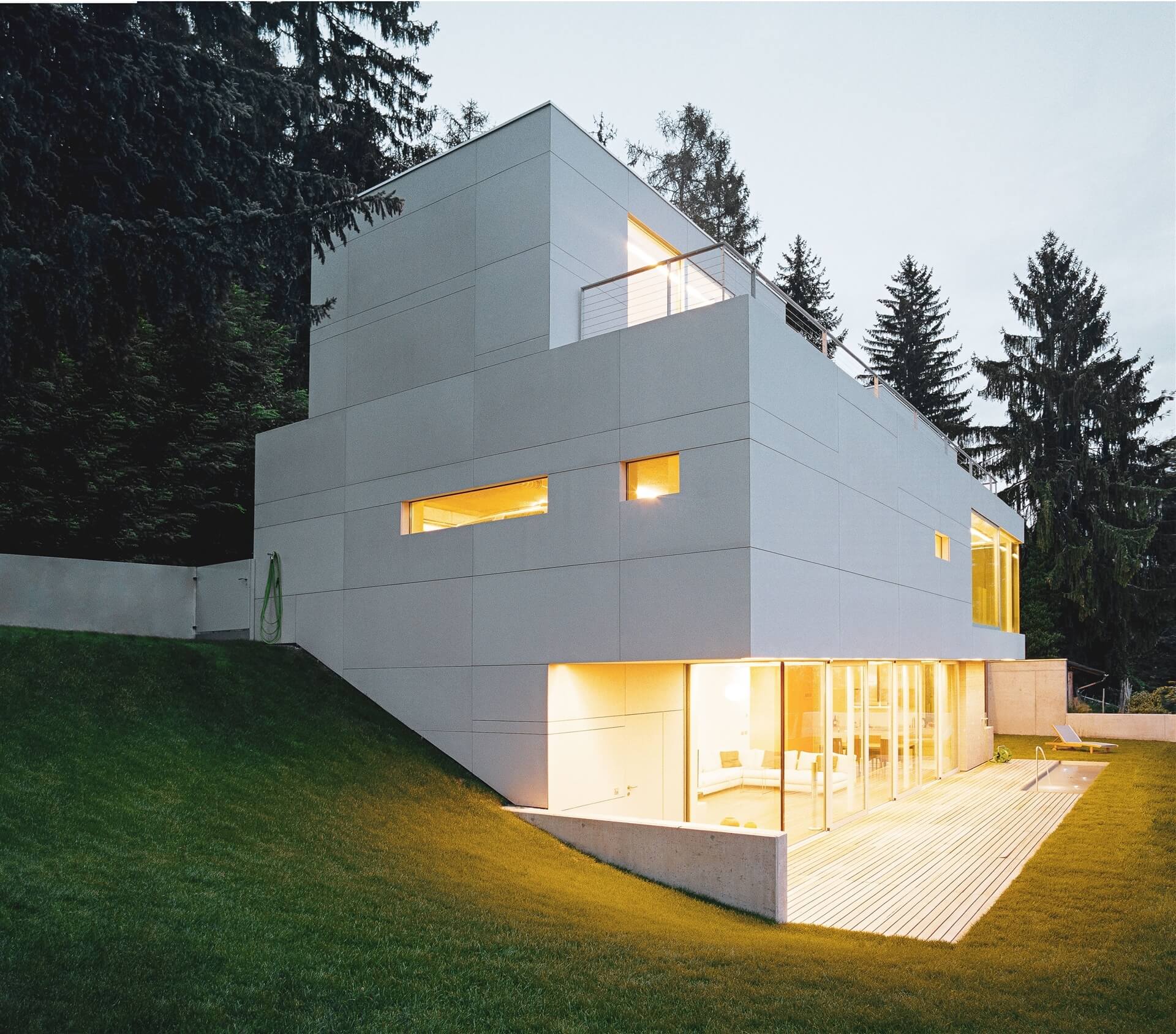 I materiali sono sempre espressione del proprio tempo. Gli architetti le interpretano per comporre una costruzione. Per questo consideriamo nostro compito la capacità di trattare materiali moderni. Nella casa privata Pirpamer si incontrano una facciata delicata in lastre di cemento rinforzate con fibre di vetro, ampi elementi di vetro e una struttura portante in acciaio. Abbiamo installato sei diversi materiali negli ambienti esterni e interni e allo stesso tempo abbiamo considerato un ulteriore punto cruciale del giorno d’oggi: offrire un servizio a tutto tondo.
