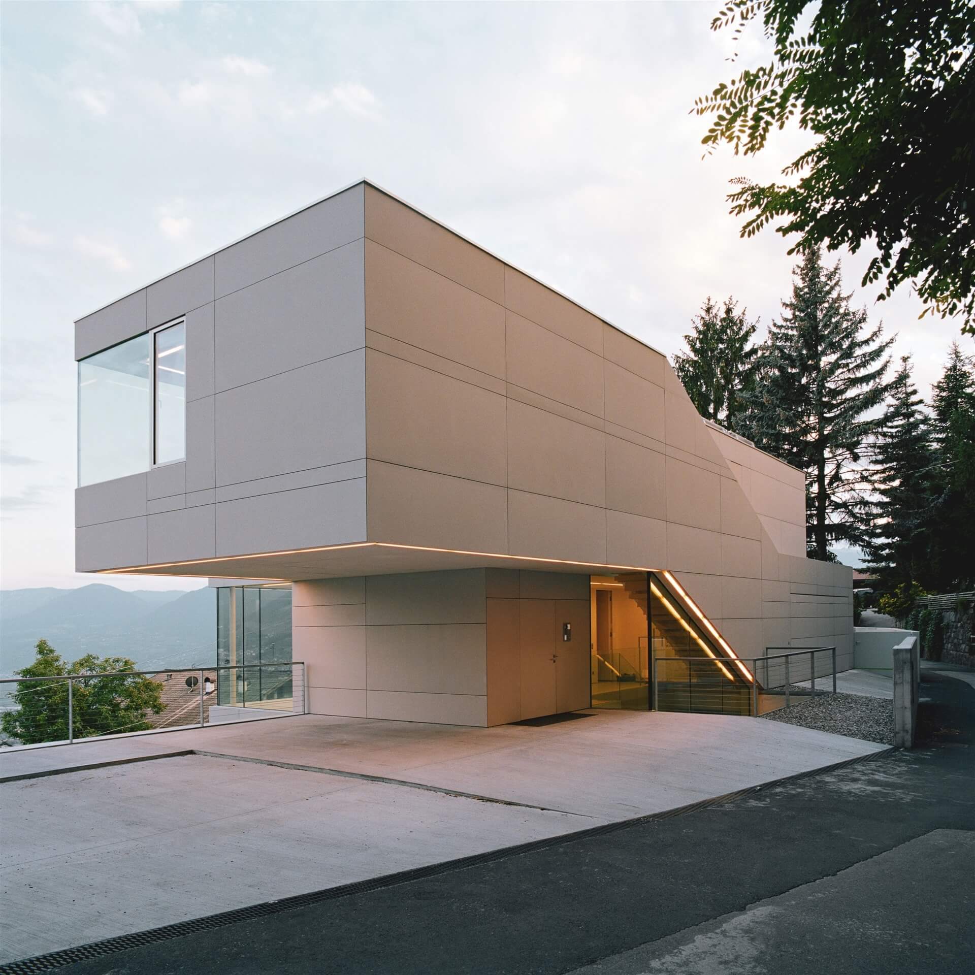 Facciata di lastre in cemento rinforzate con fibre di vetro, facciate in vetro, infissi, scale in acciaio, parapetti in vetro, ringhiere all’esterno in acciaio zincato e con fili in acciaio inossidabile